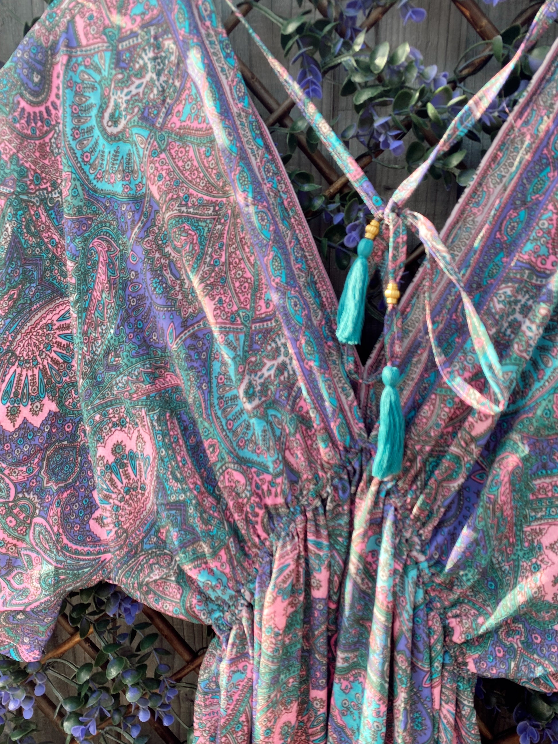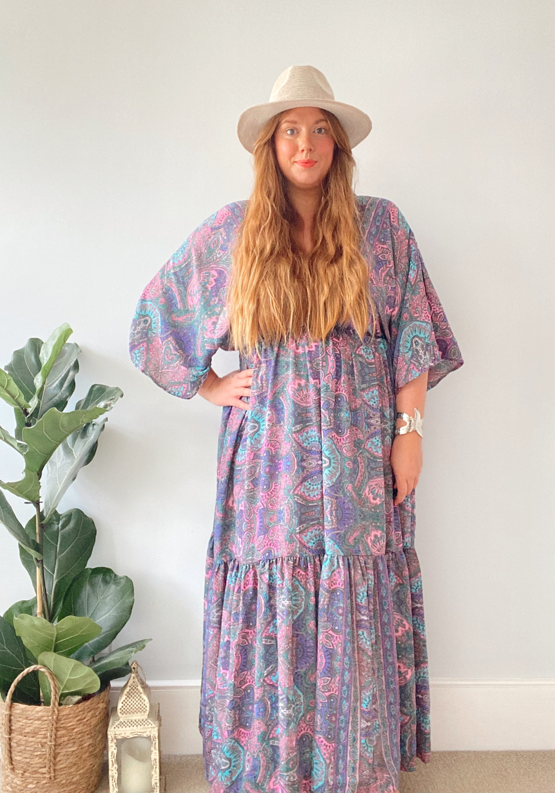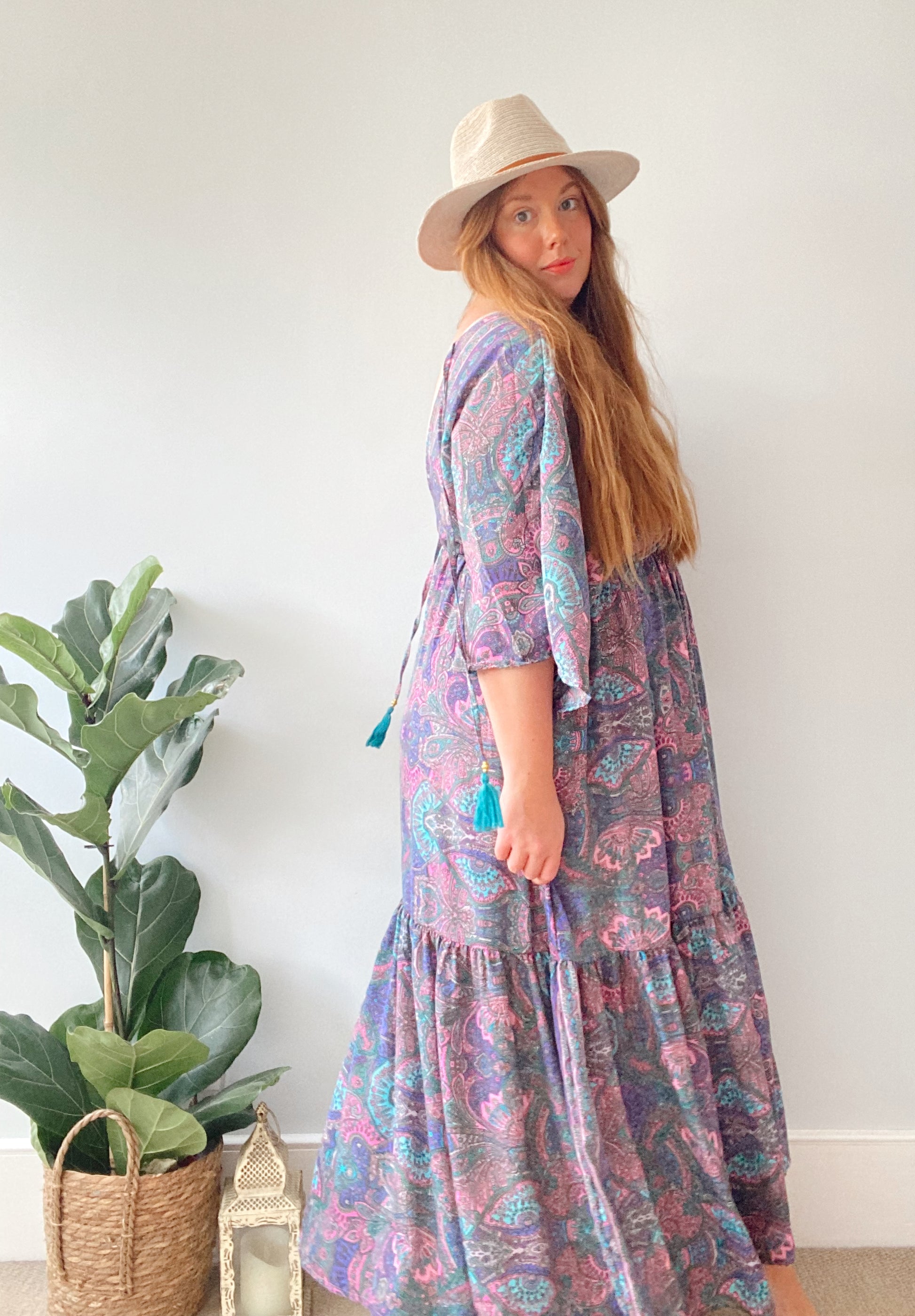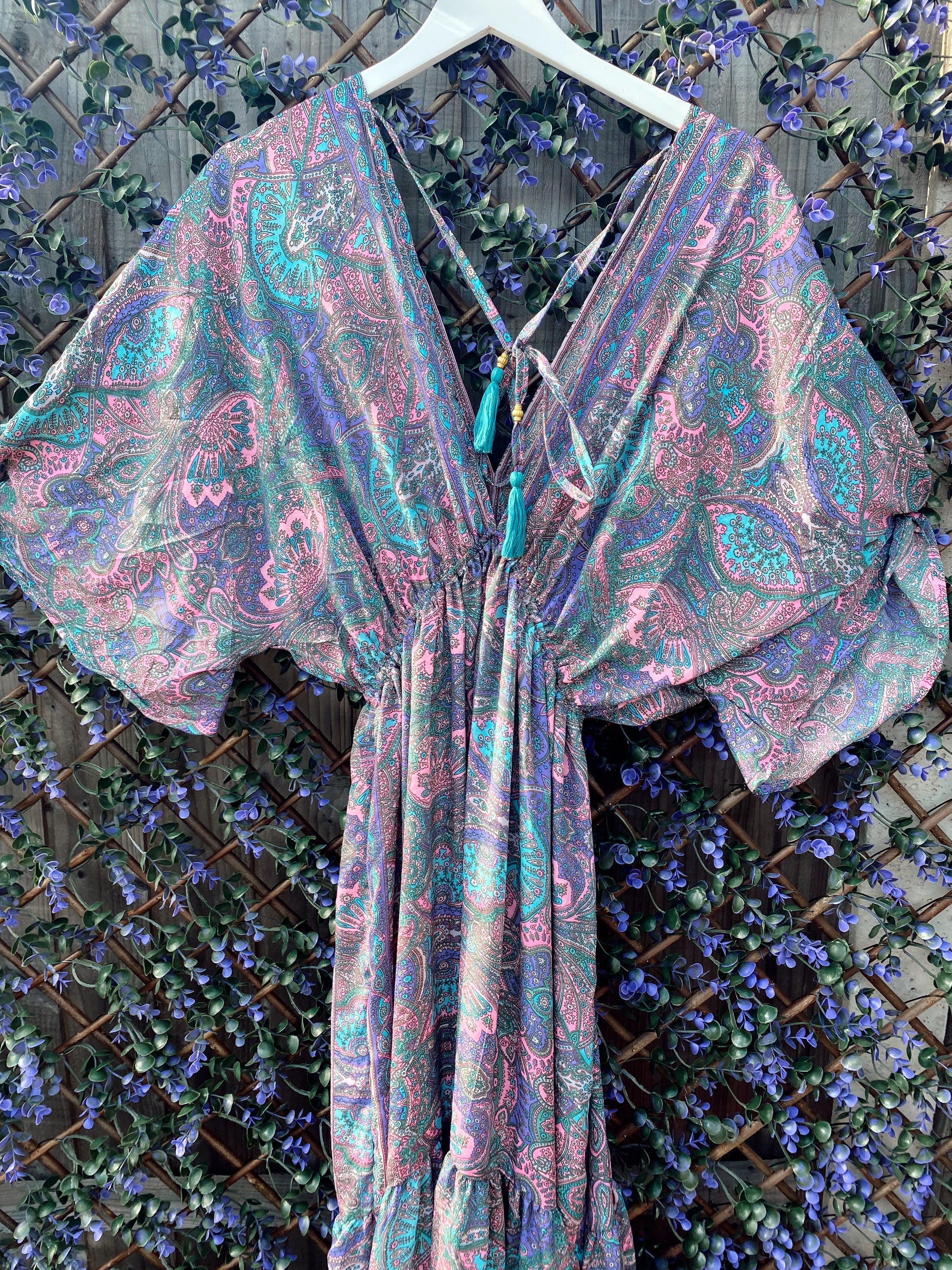 The Cora dress is made from luxurious silk and flows beautifully over the silhouette. It's a free size that fits a UK 8-16/18 and has kimono sleeves with tassels at the back. This bohemian dress is a must for any eclectic wardrobe.