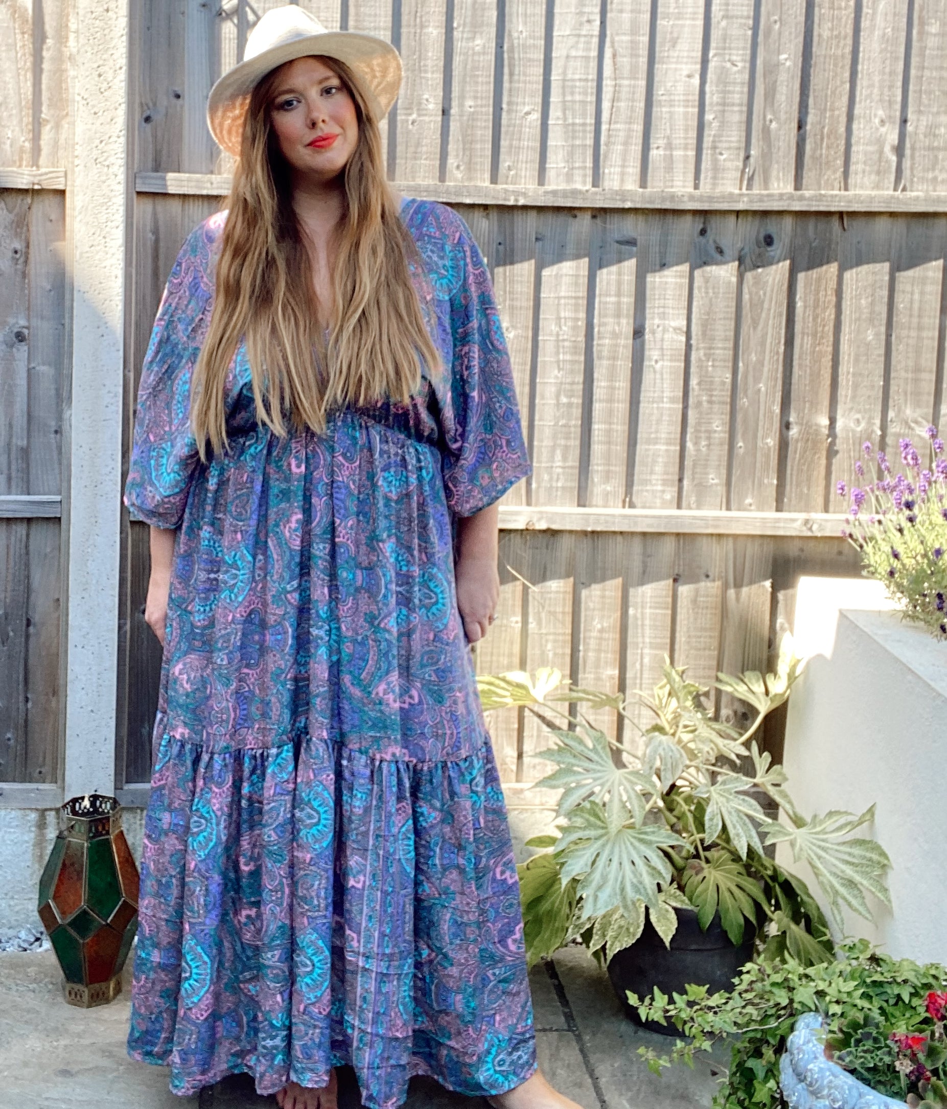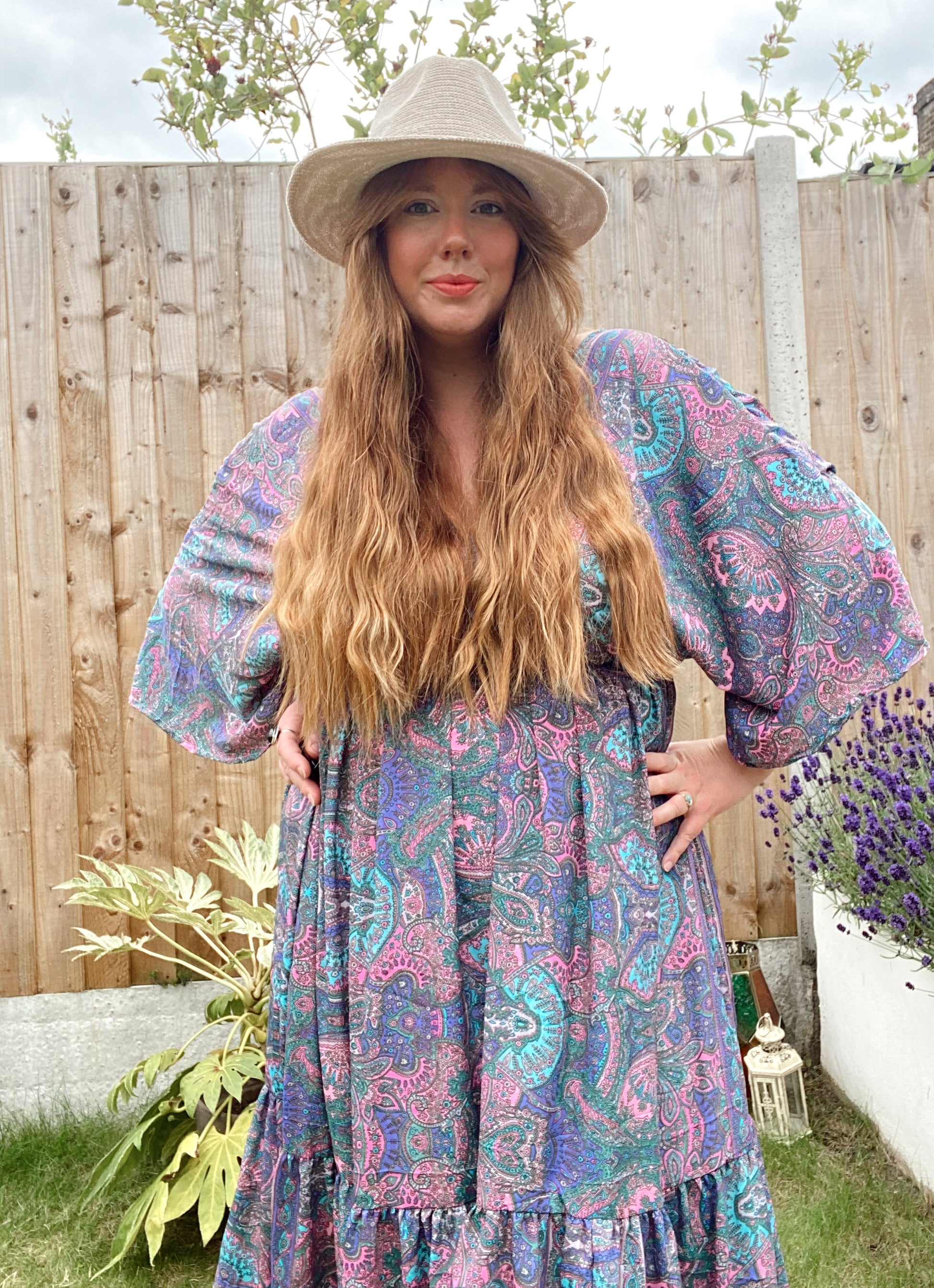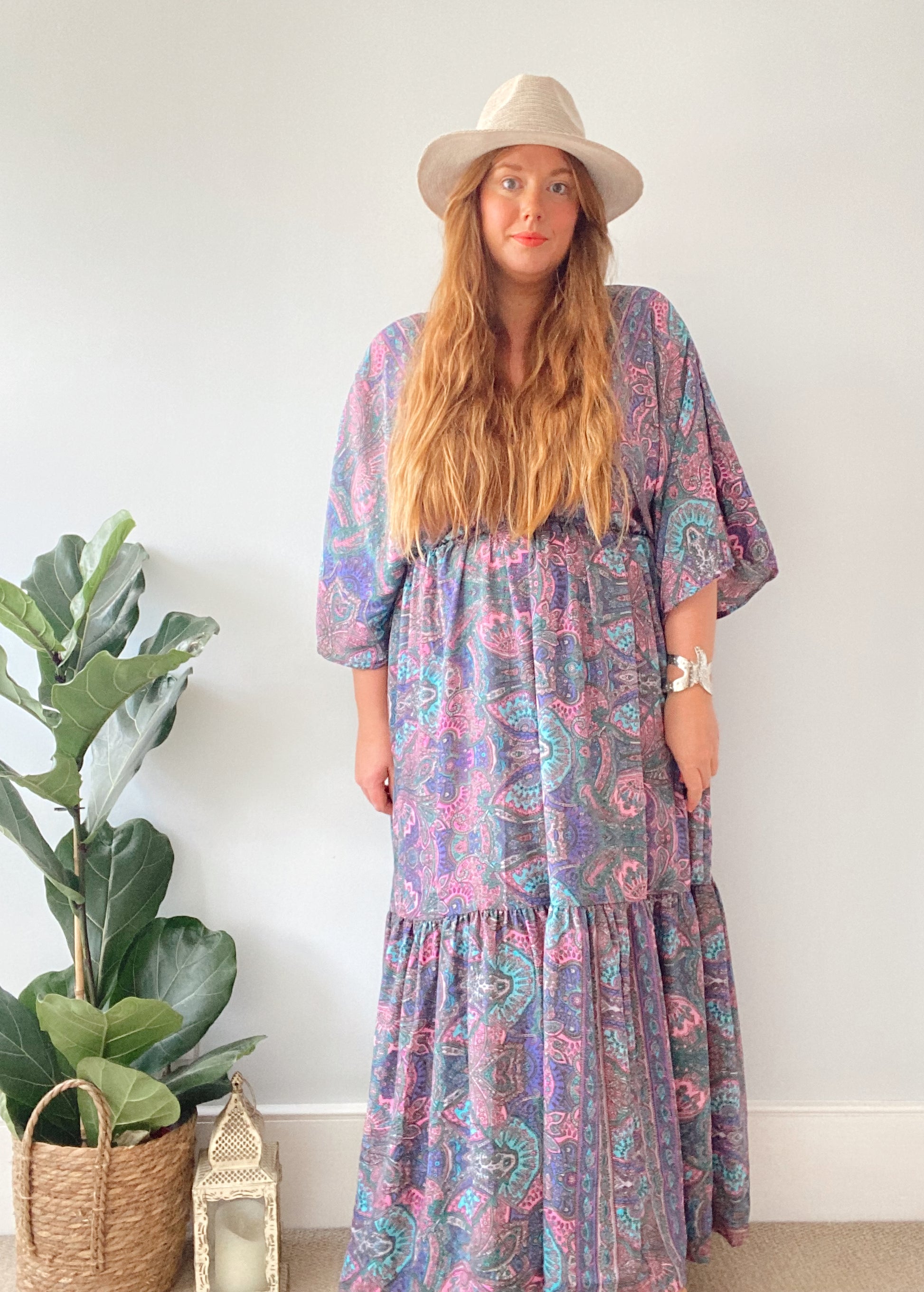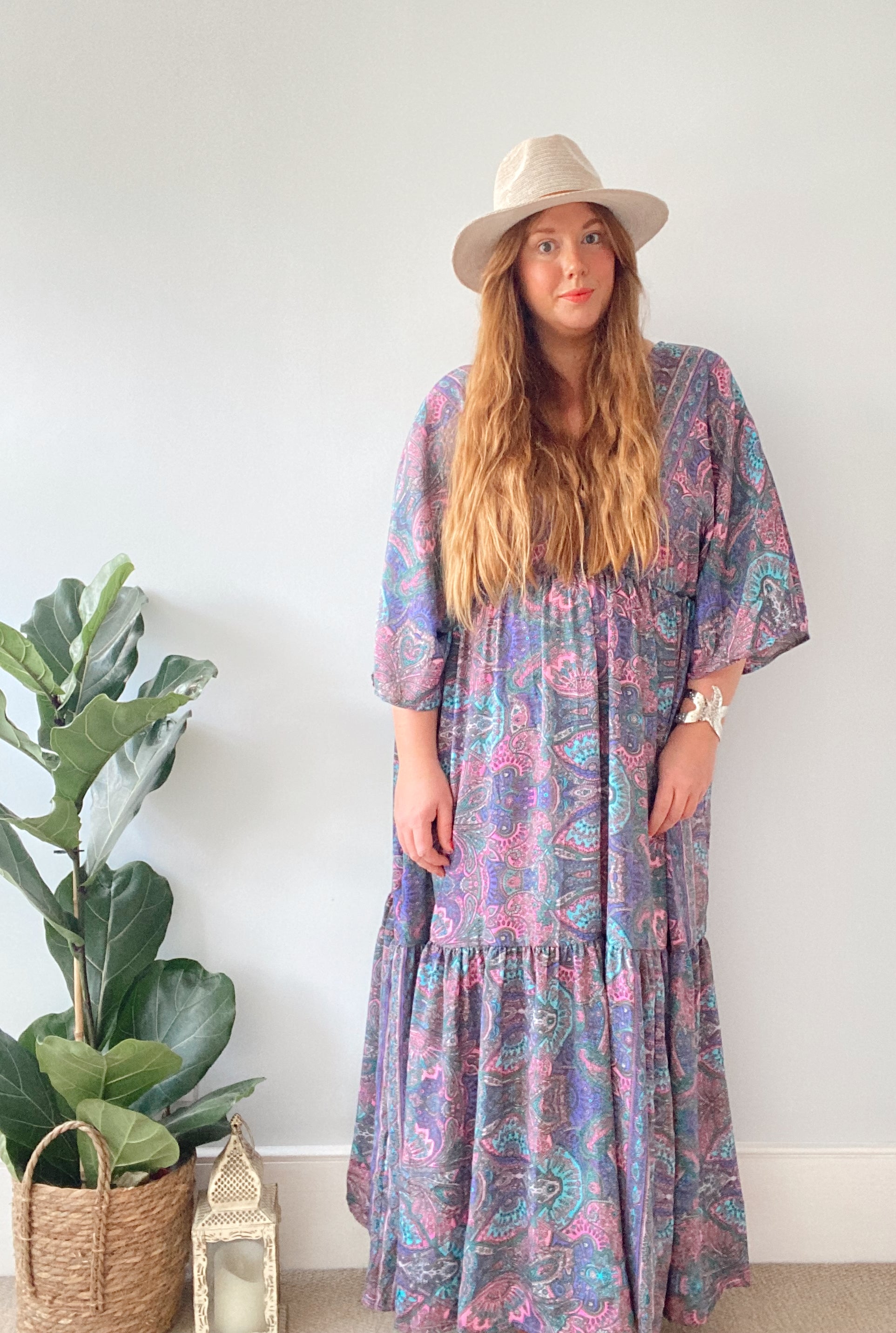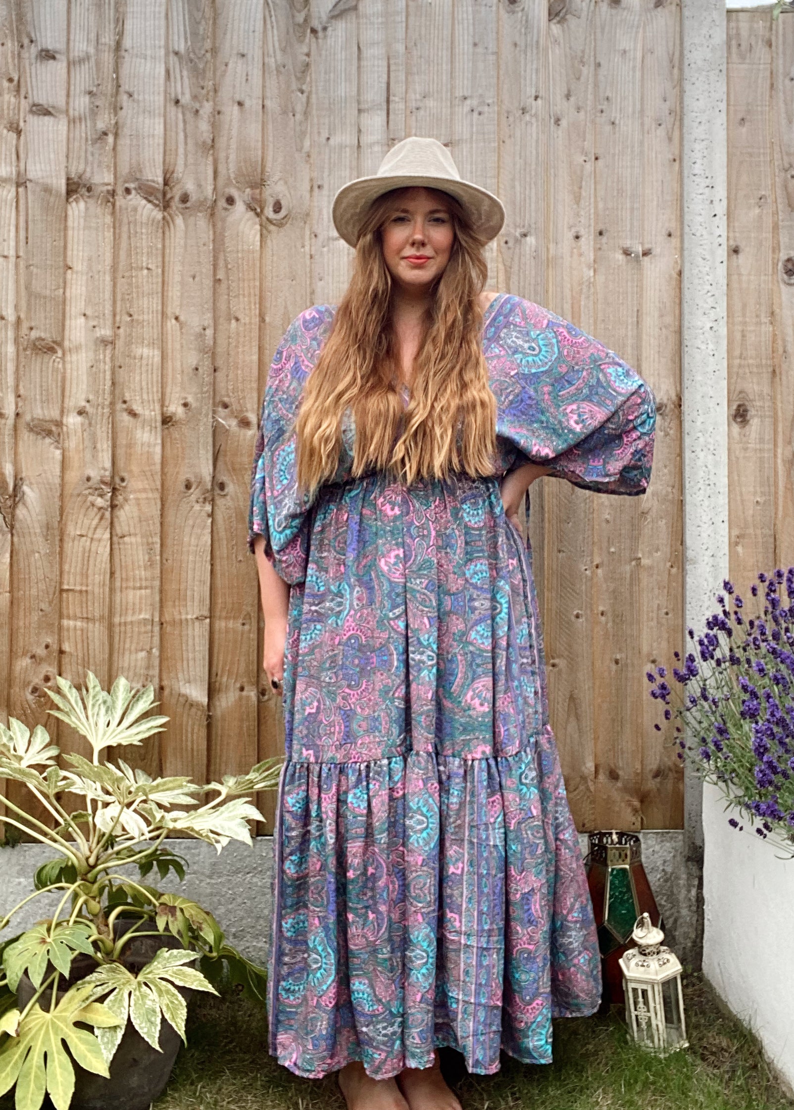 The Cora dress is made from luxurious silk and flows beautifully over the silhouette. It's a free size that fits a UK 8-16/18 and has kimono sleeves with tassels at the back. This bohemian dress is a must for any eclectic wardrobe.