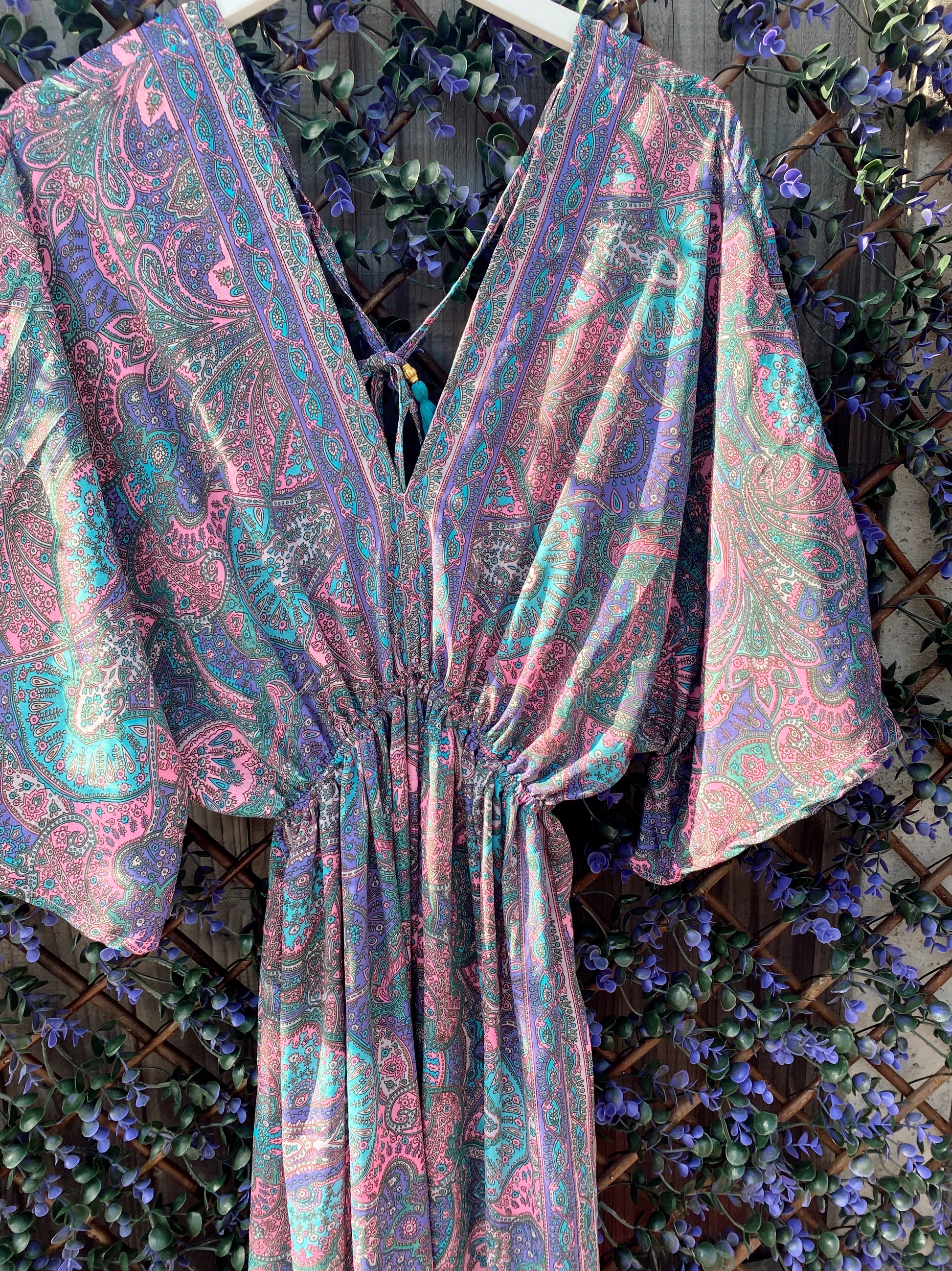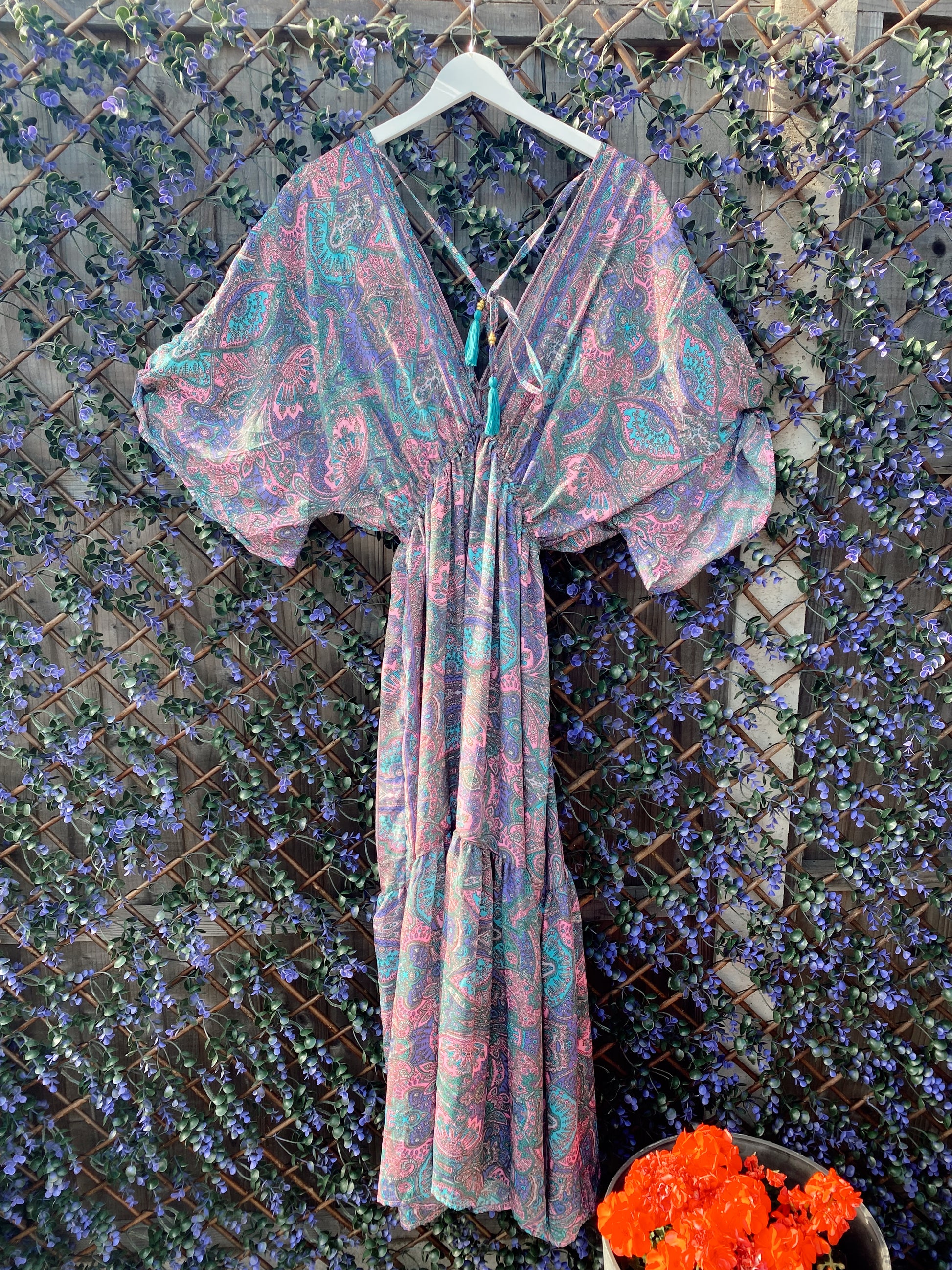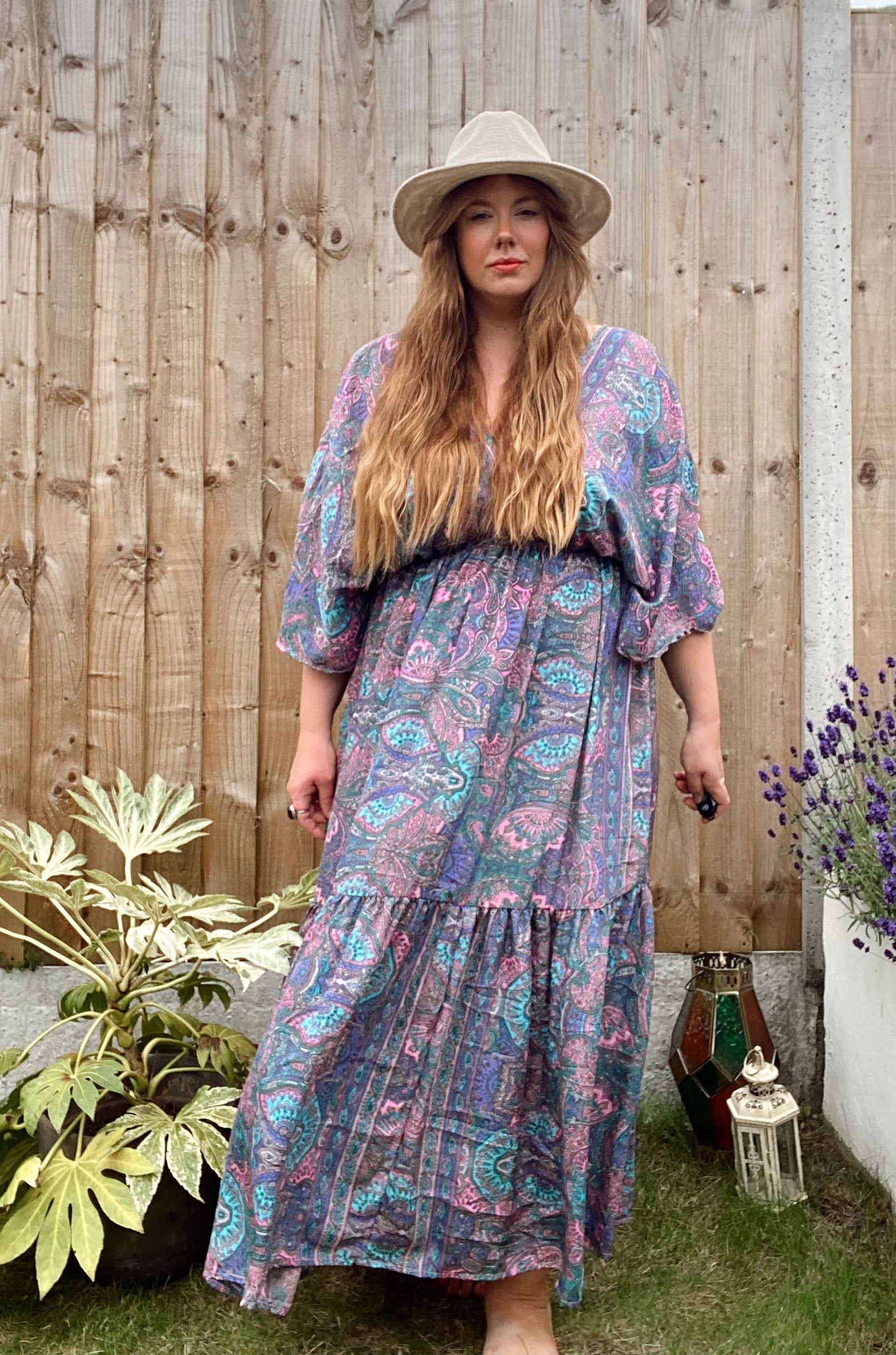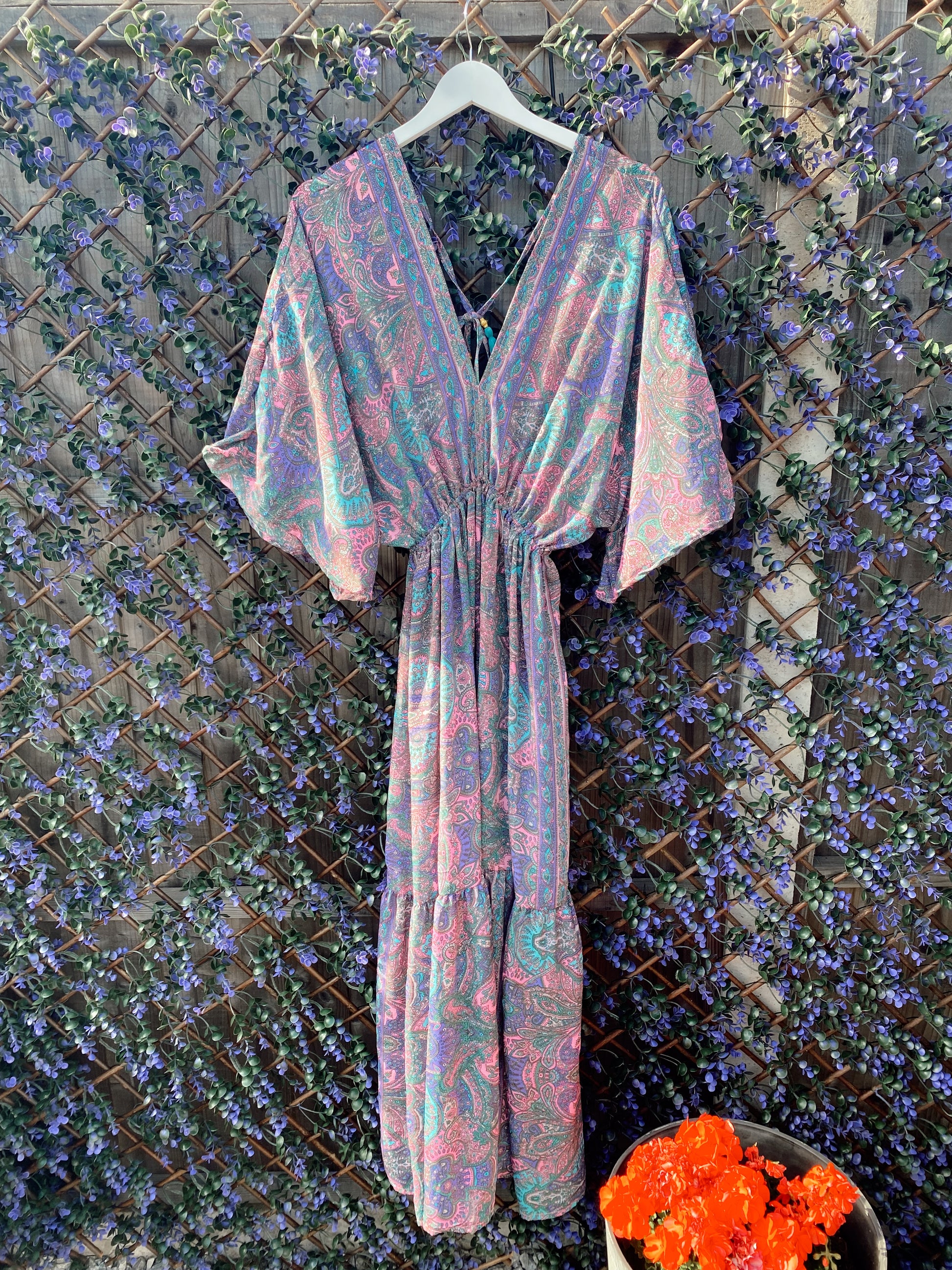 The Cora dress is made from luxurious silk and flows beautifully over the silhouette. It's a free size that fits a UK 8-16/18 and has kimono sleeves with tassels at the back. This bohemian dress is a must for any eclectic wardrobe.
