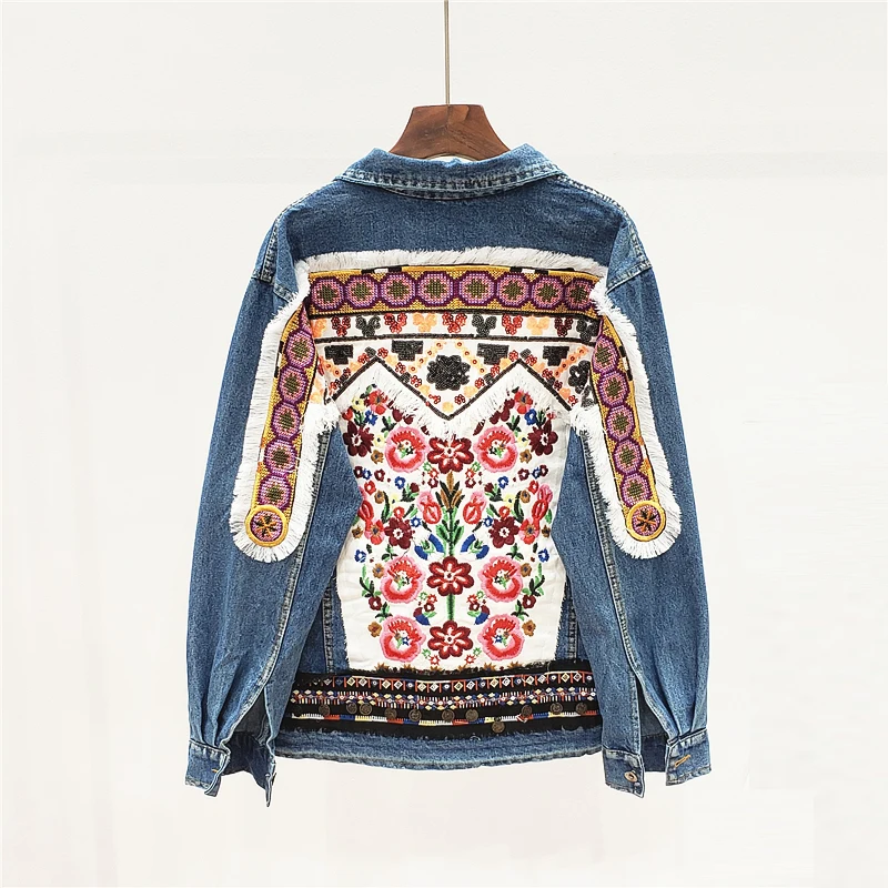 Inspired by 1970s folk styles this cool denim jacket is ideal for all year. It's cut to an oversized one-size fits all design and fits up to UK 16, it features beautiful hand embroidery on the back in a bohemian multicoloured design. It works perfectly over a midi dress or paired with denim and a casual T-shirt. The bohemian design lends it a vintage feel.
