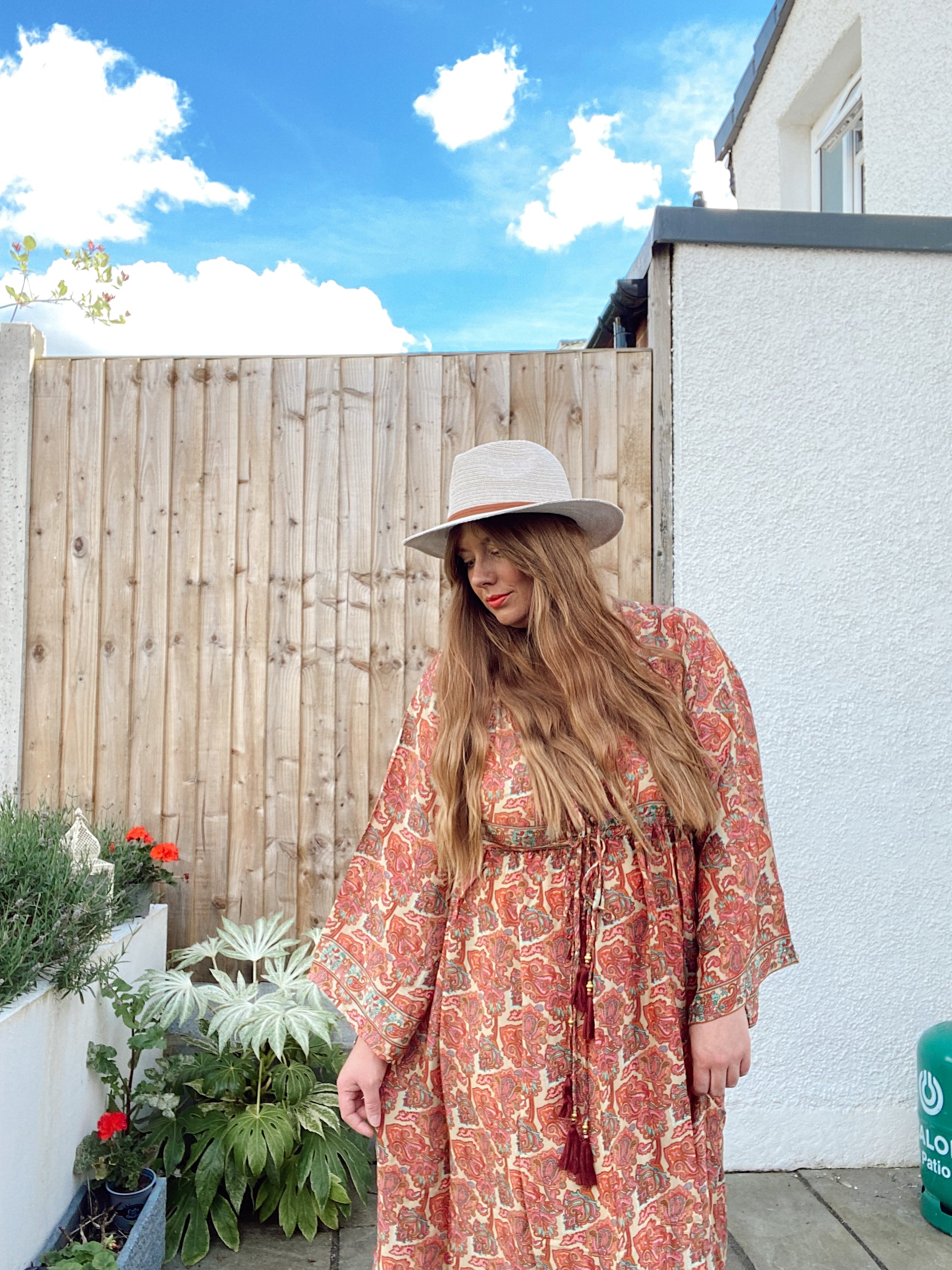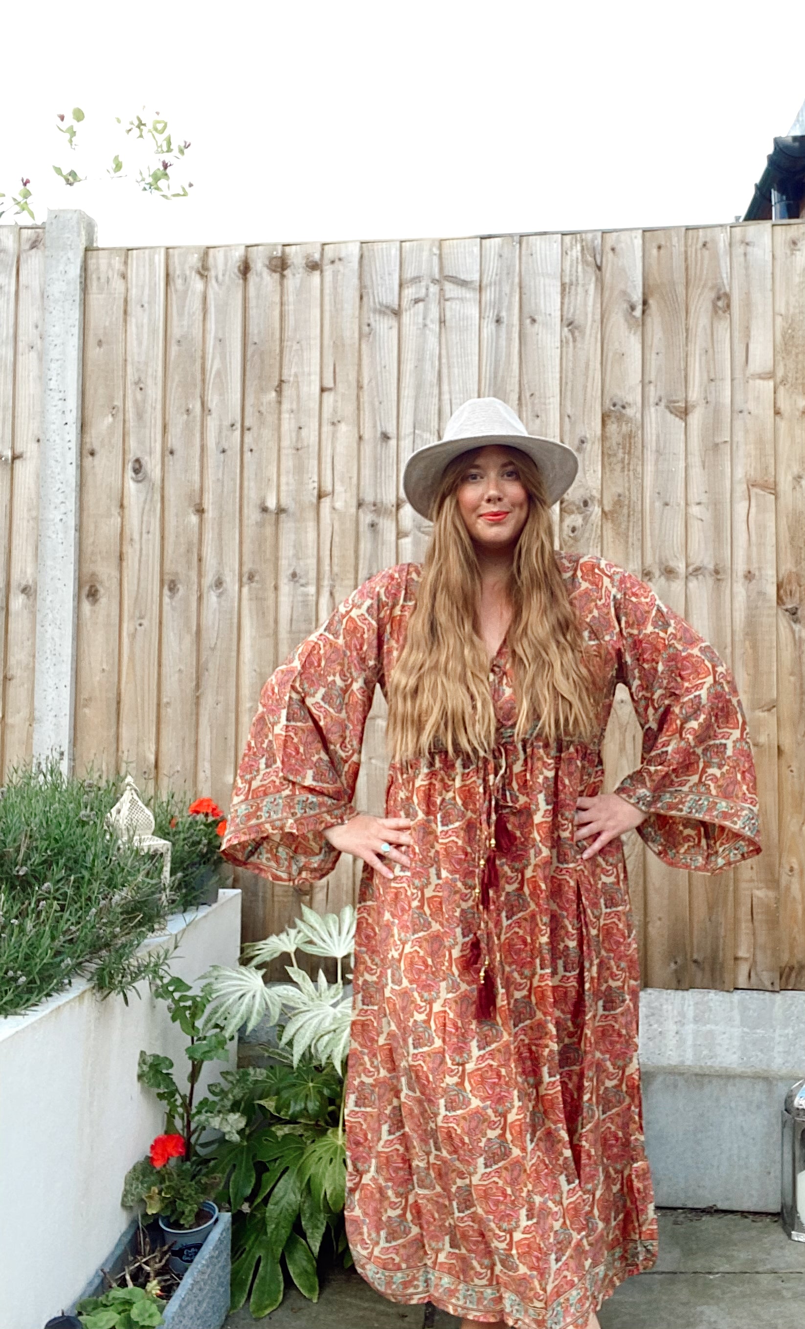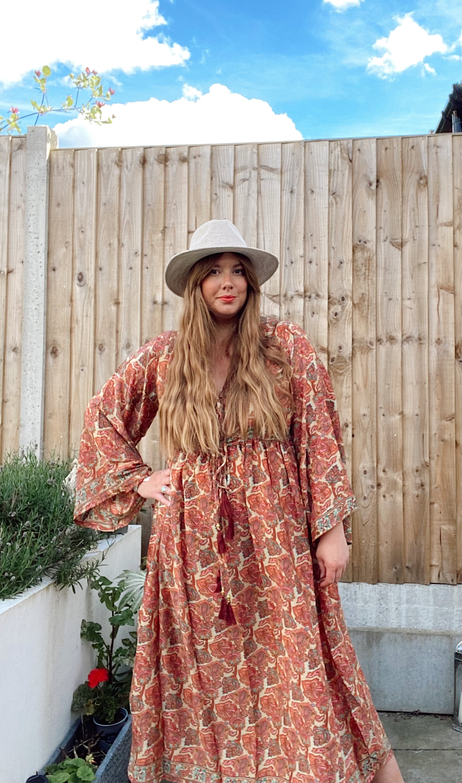 This beautiful Nova dress is made from silk and is a free-size design that can be tied at the waist and bust to suit your figure. It has long flute sleeves and falls into a floaty dress. It features a stunning bohemian vintage-inspired print and is a piece you'll wear through all seasons.