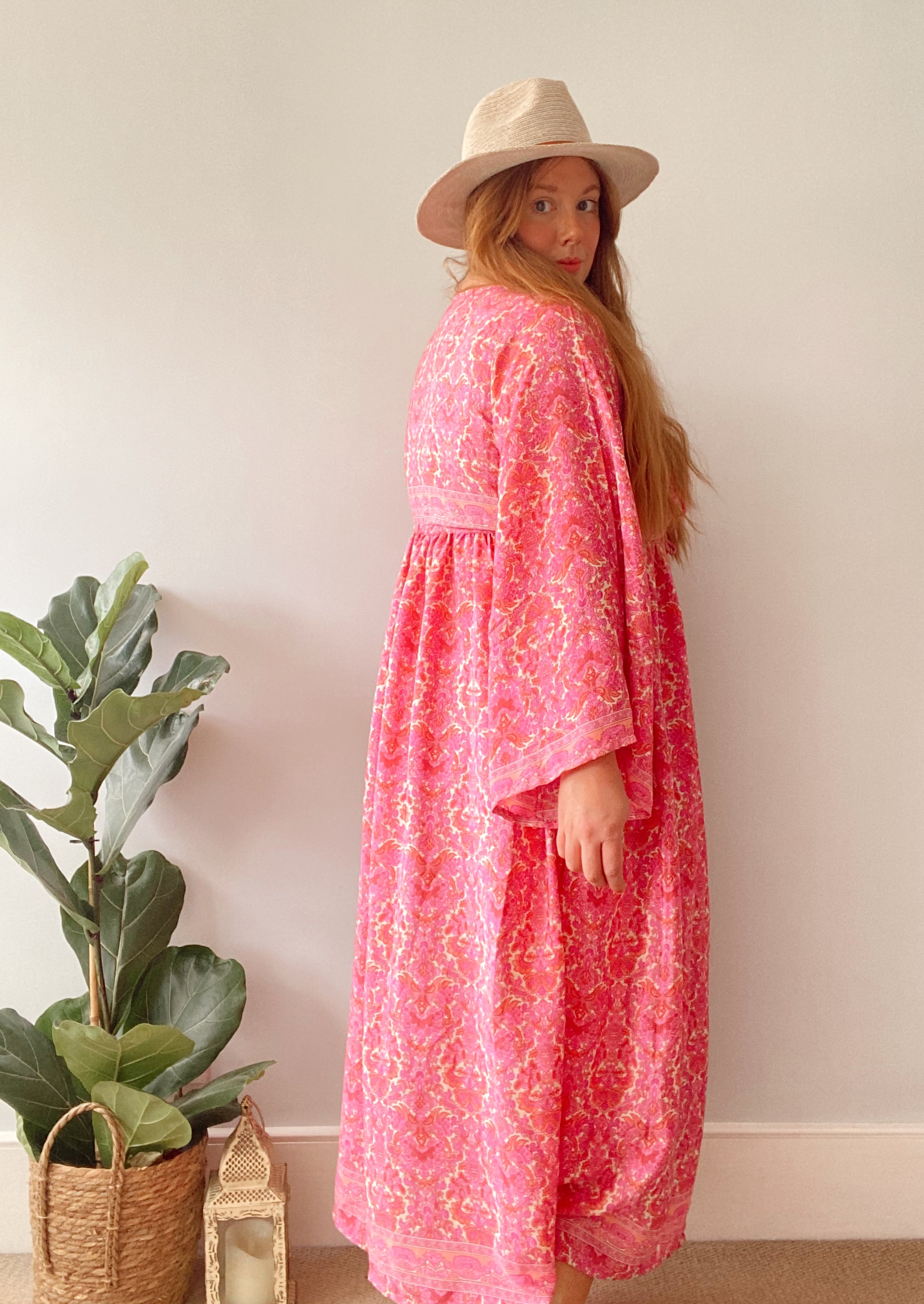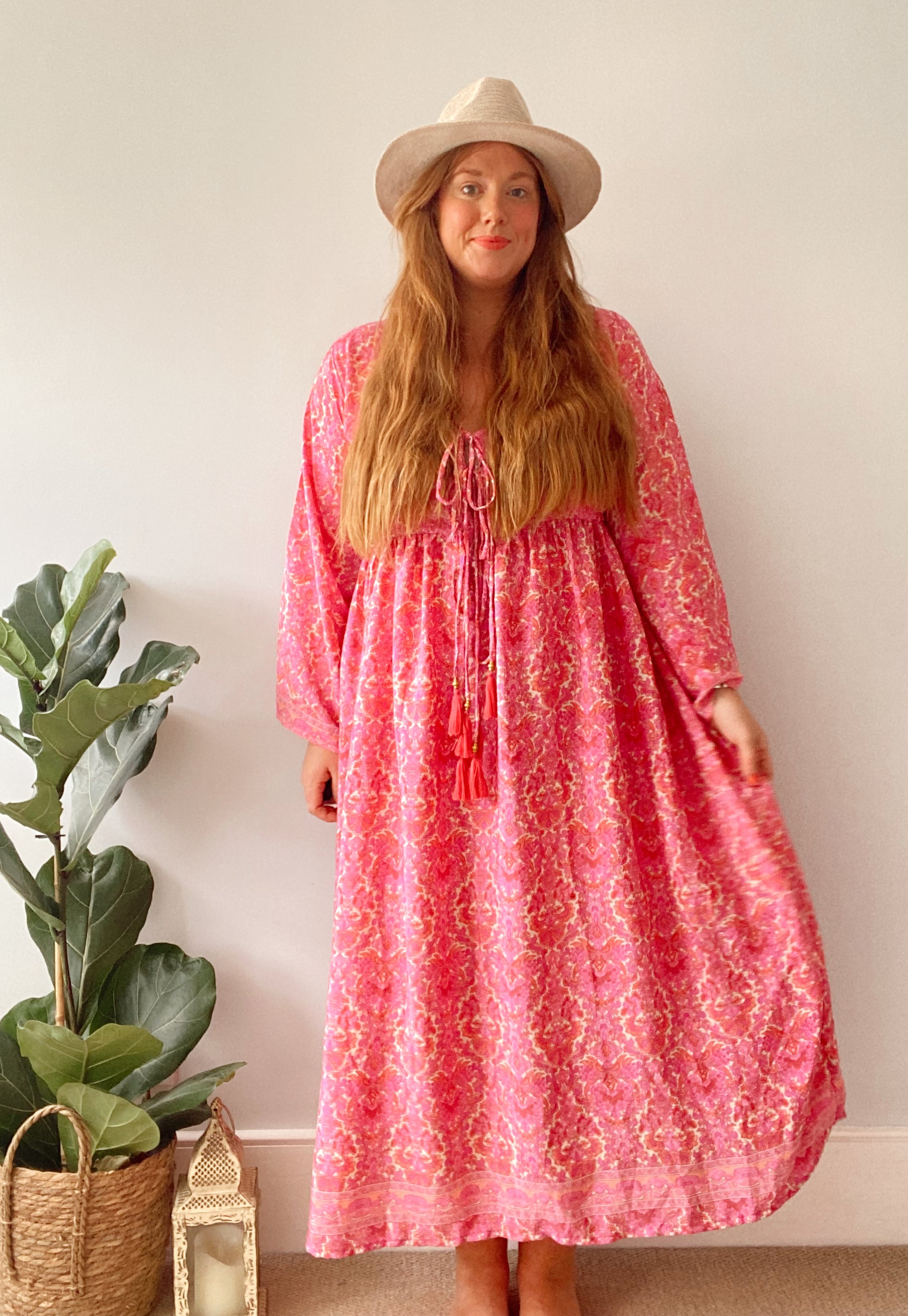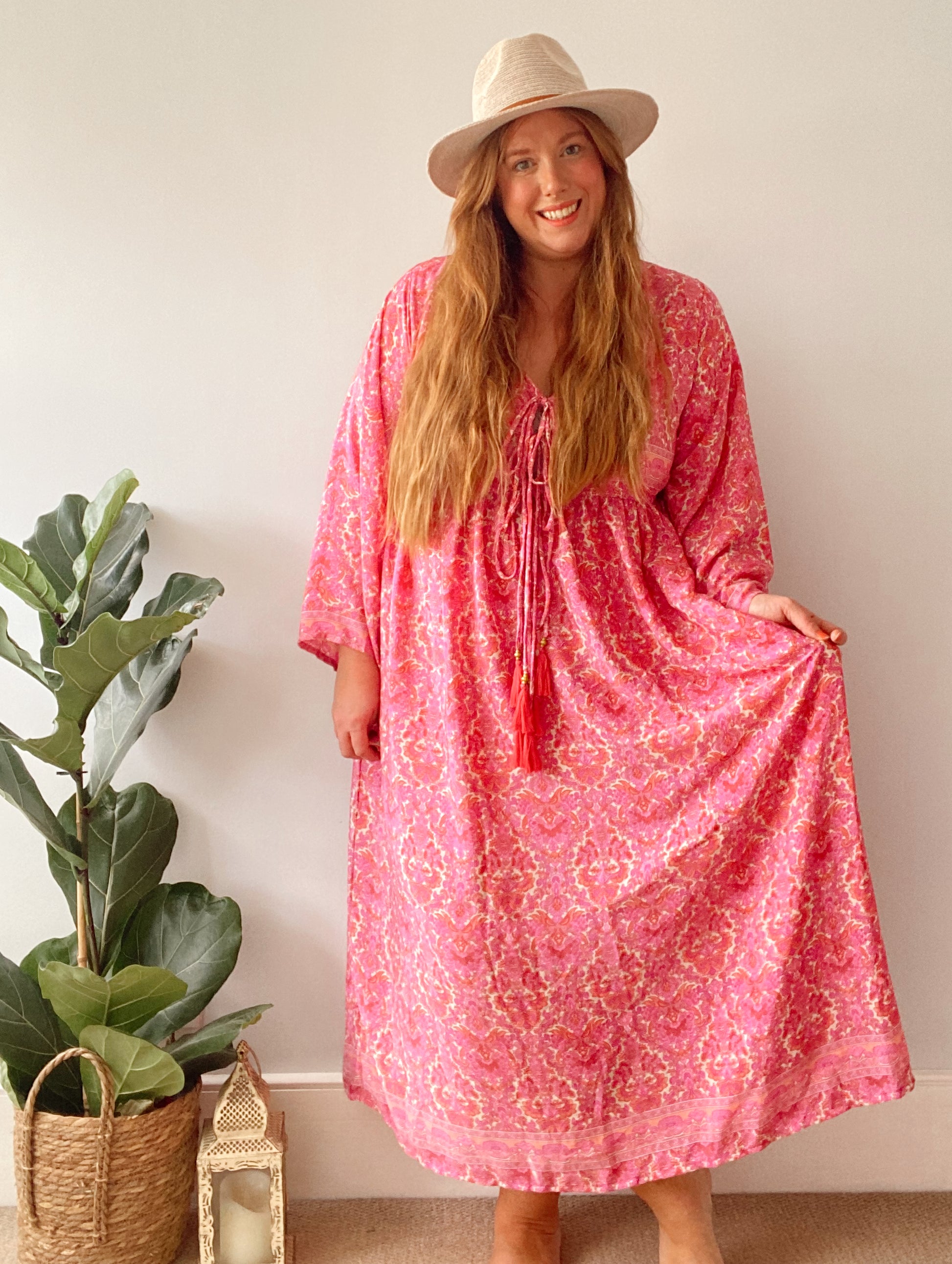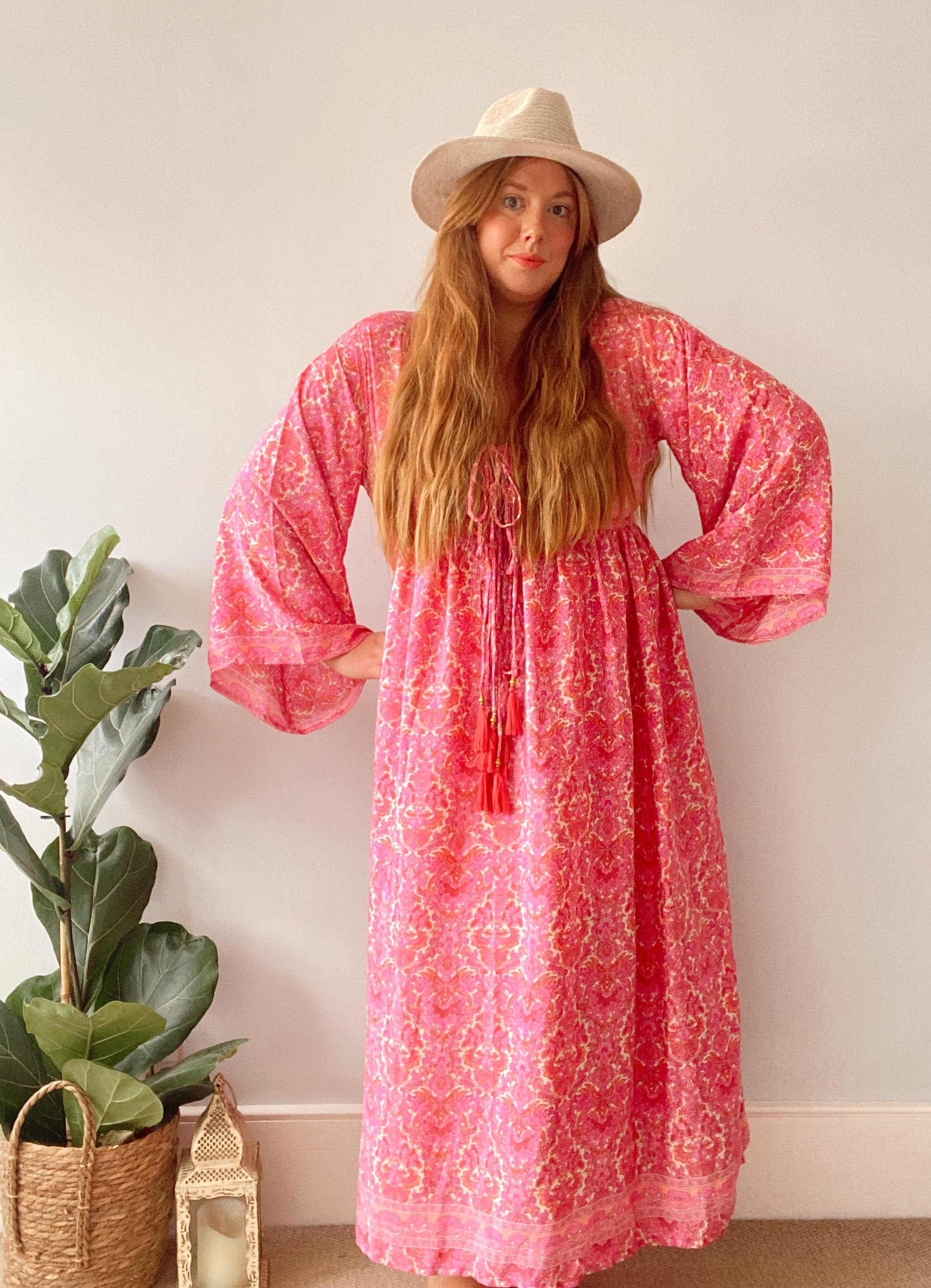 This beautiful Nova dress is made from silk and is a free-size design that can be tied at the waist and bust to suit your figure. It has long flute sleeves and falls into a floaty dress. It features a stunning bohemian vintage-inspired print and is a piece you'll wear through all seasons.