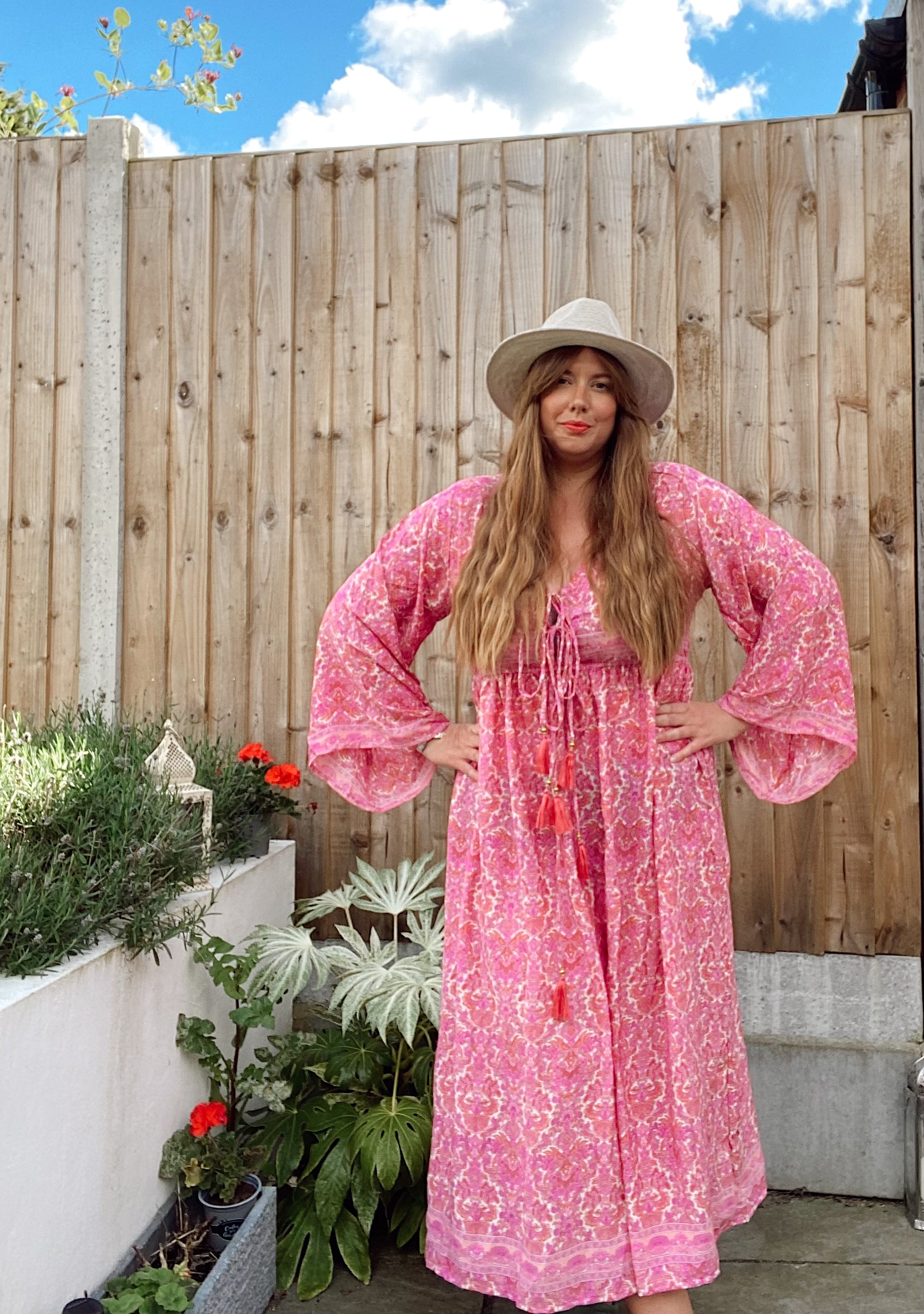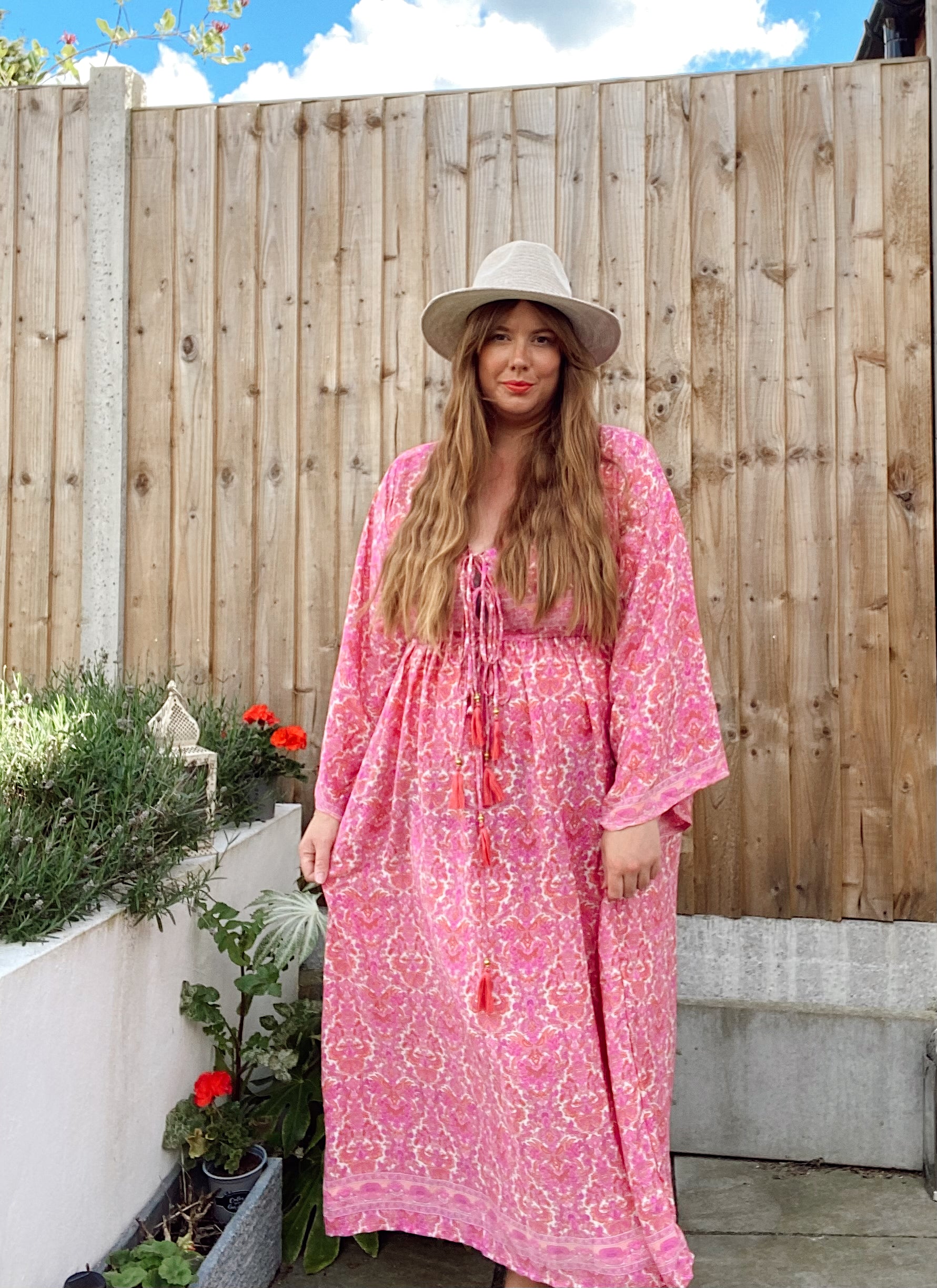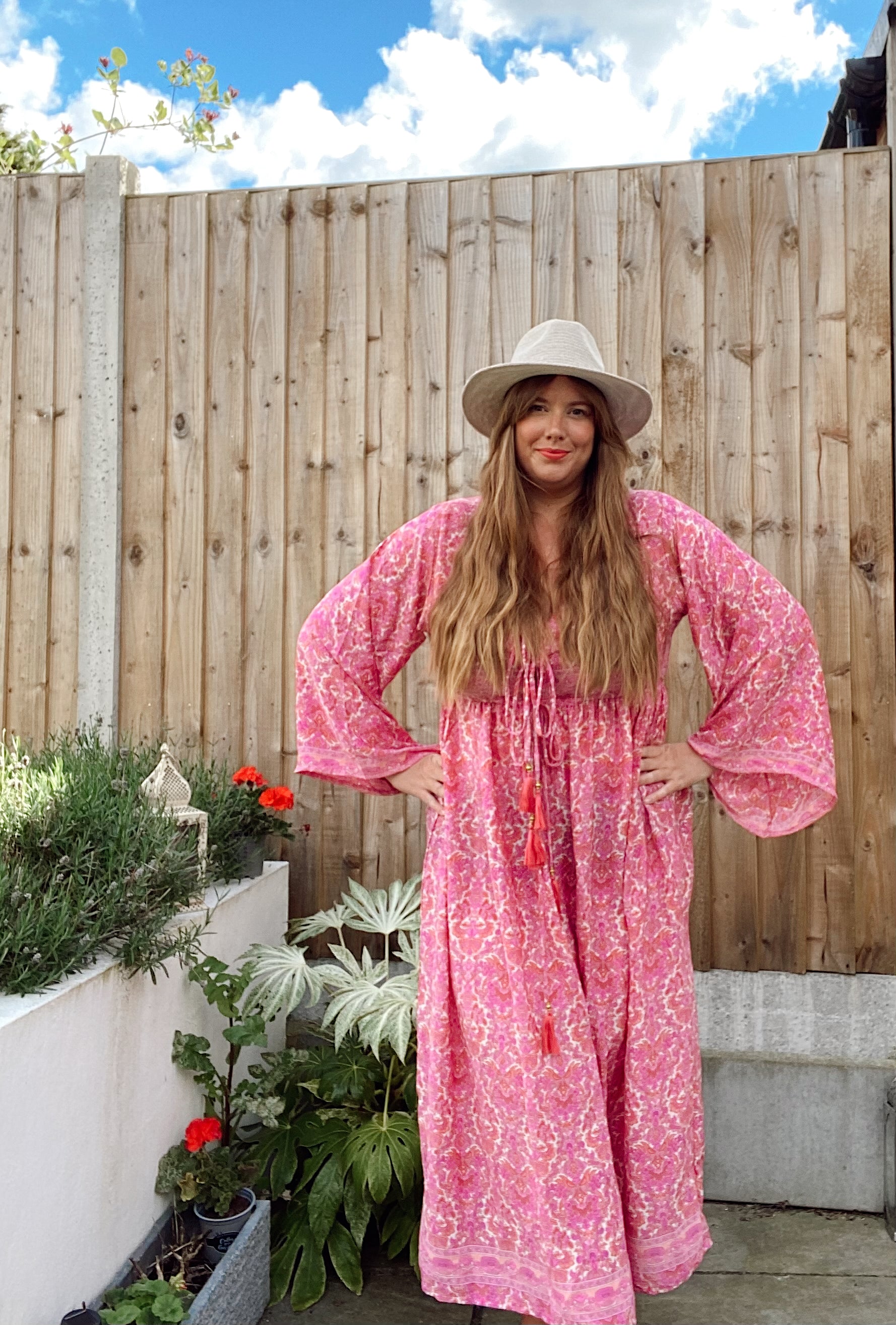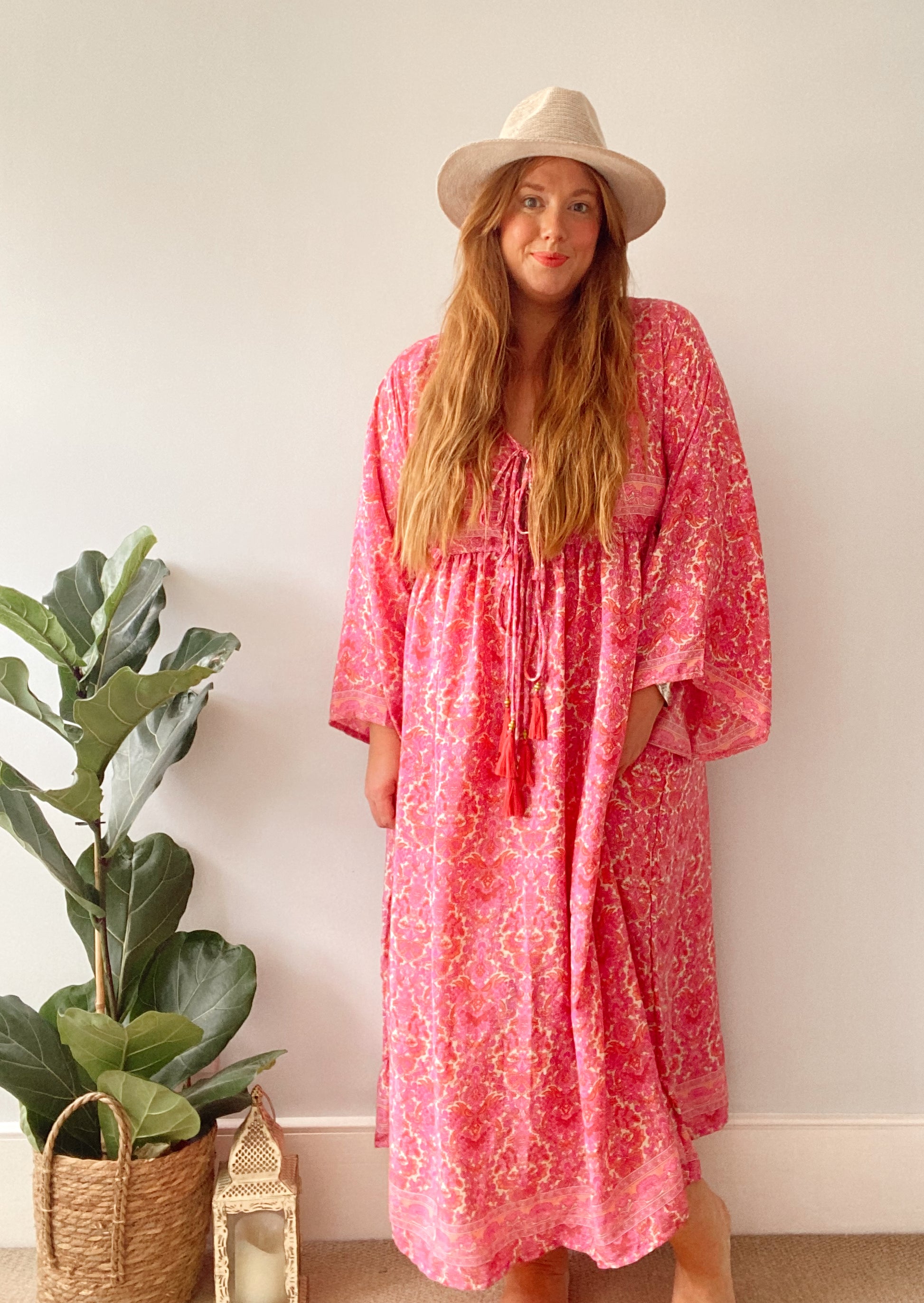 This beautiful Nova dress is made from silk and is a free-size design that can be tied at the waist and bust to suit your figure. It has long flute sleeves and falls into a floaty dress. It features a stunning bohemian vintage-inspired print and is a piece you'll wear through all seasons.