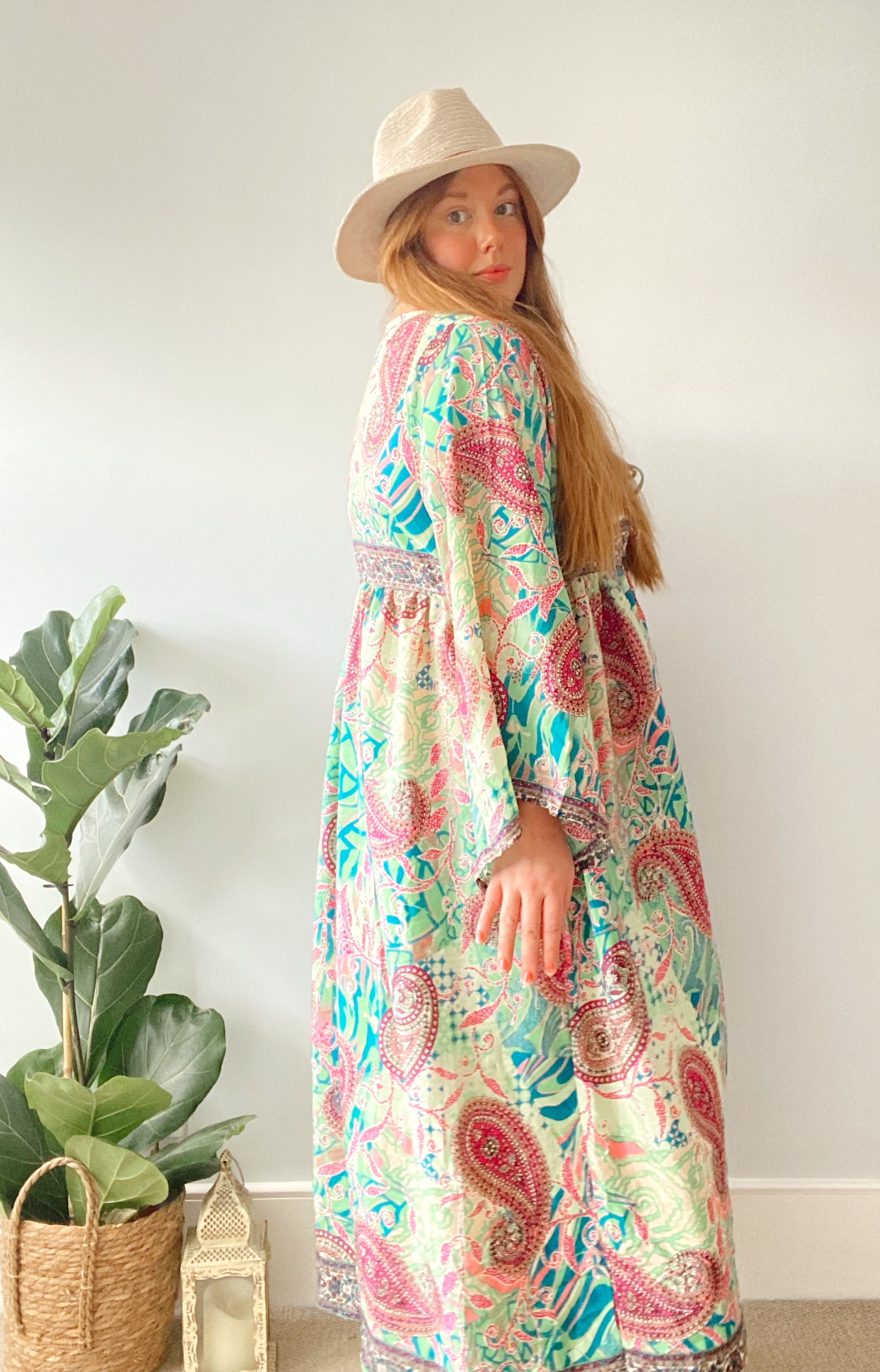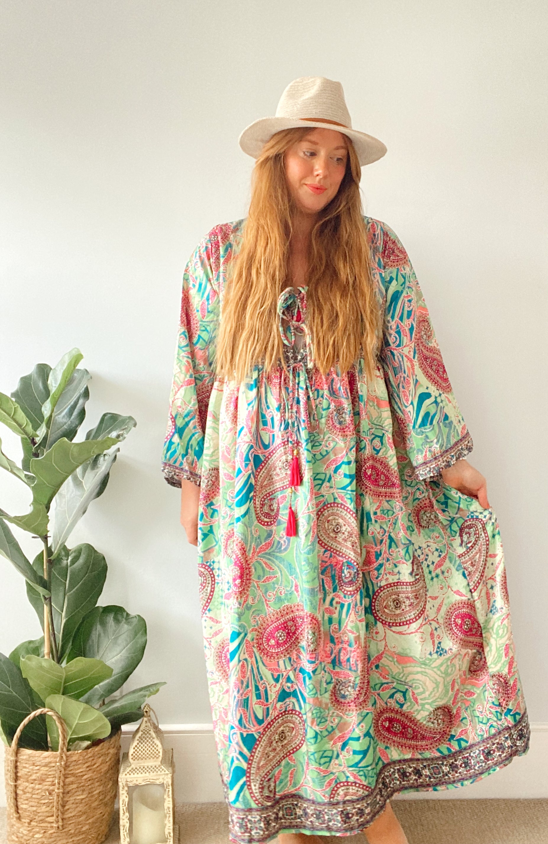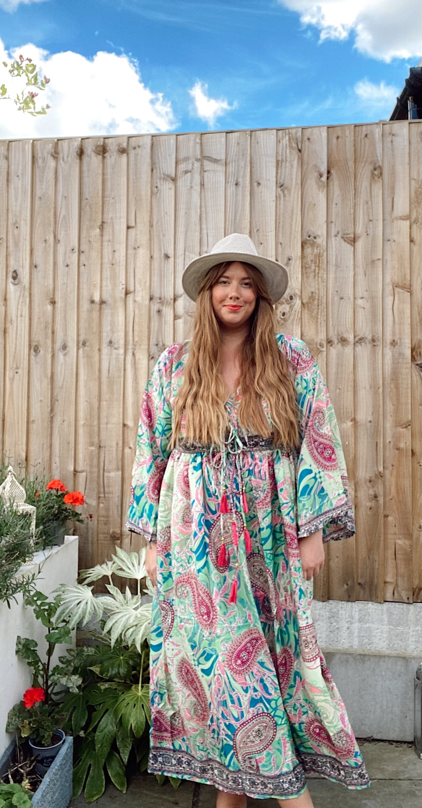 This beautiful Nova dress is made from silk and is a free-size design that can be tied at the waist and bust to suit your figure. It has long flute sleeves and falls into a floaty dress. It features a stunning bohemian vintage-inspired print and is a piece you'll wear through all seasons.