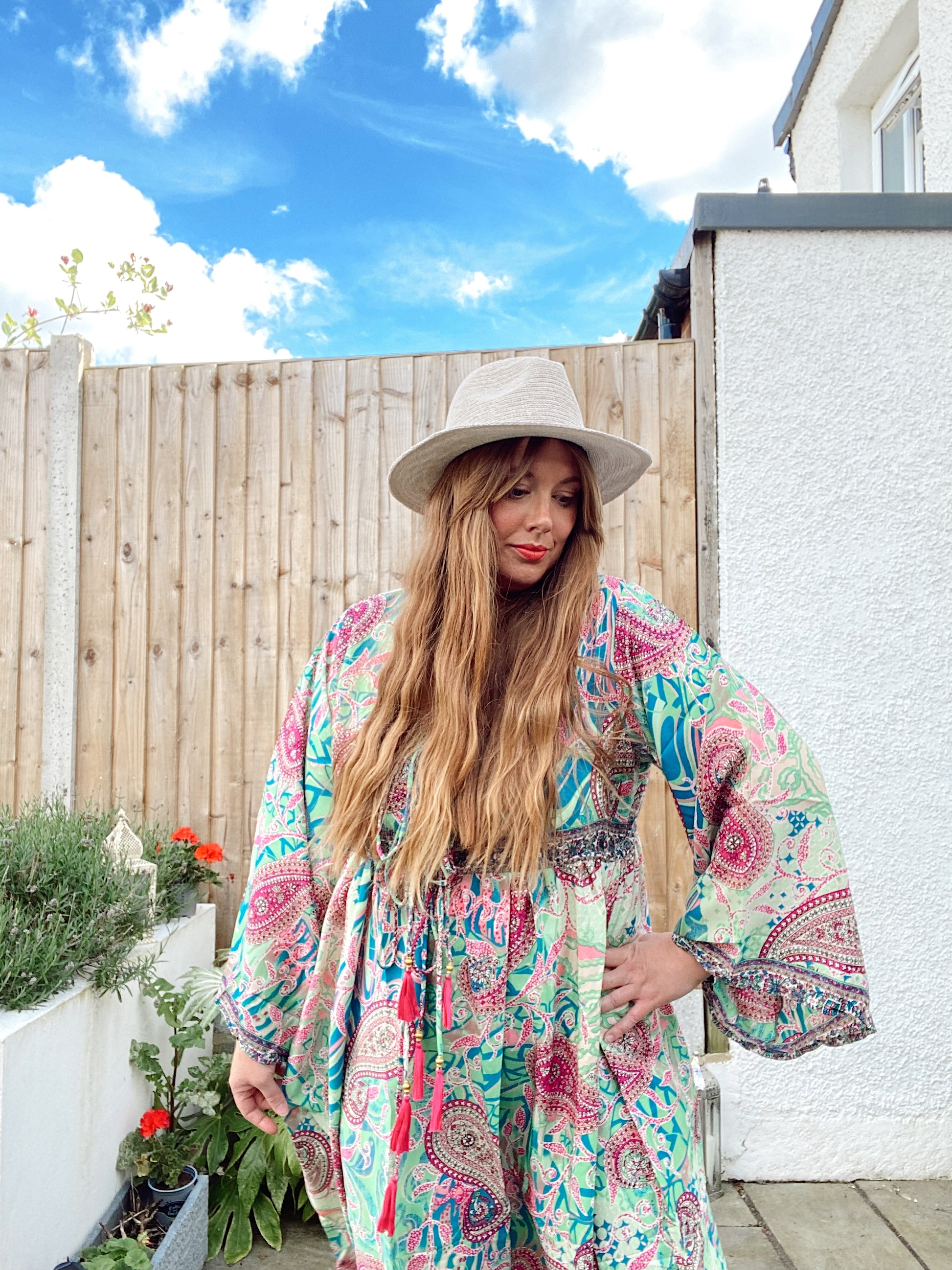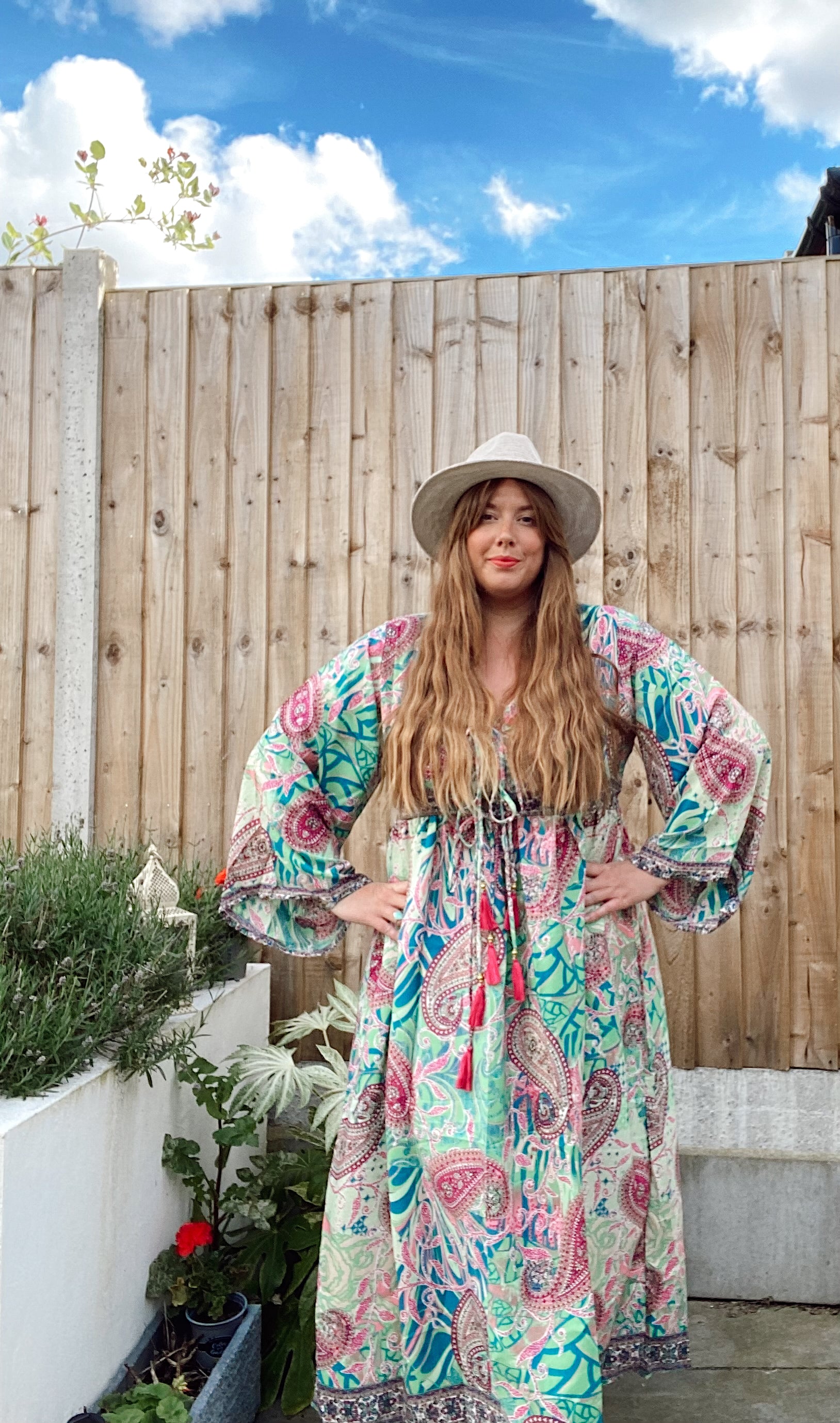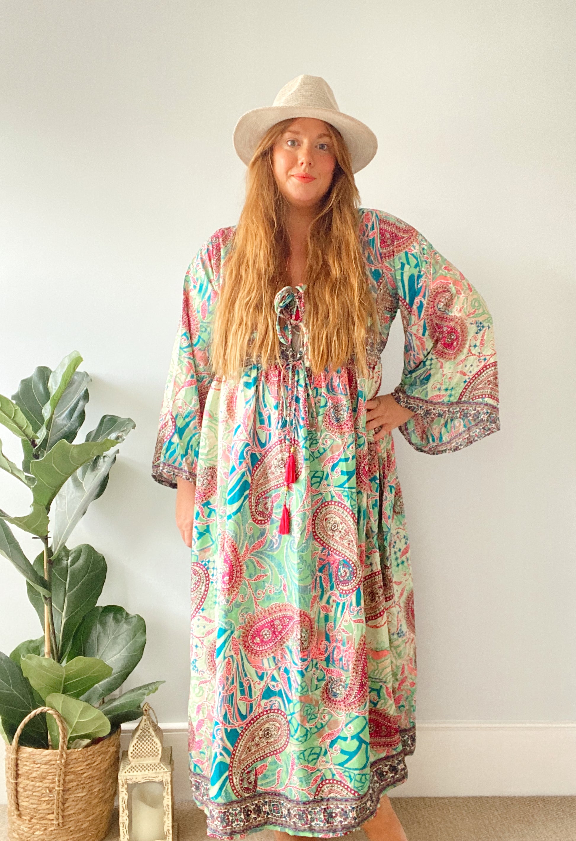This beautiful Nova dress is made from silk and is a free-size design that can be tied at the waist and bust to suit your figure. It has long flute sleeves and falls into a floaty dress. It features a stunning bohemian vintage-inspired print and is a piece you'll wear through all seasons.