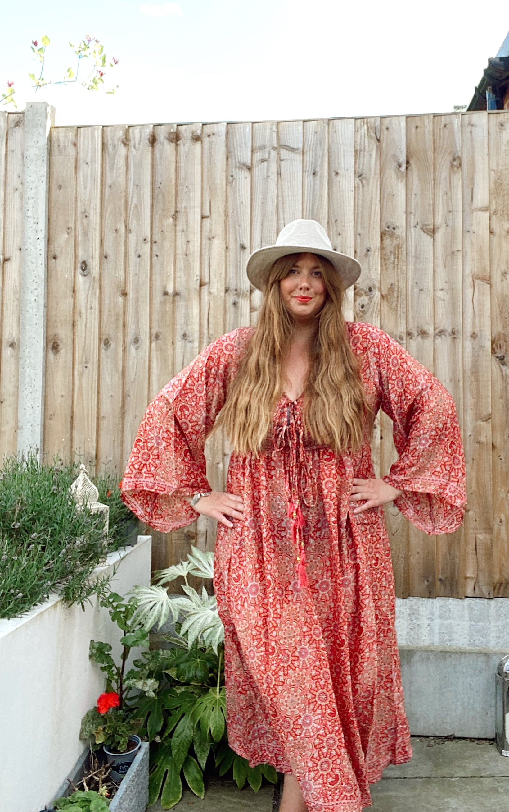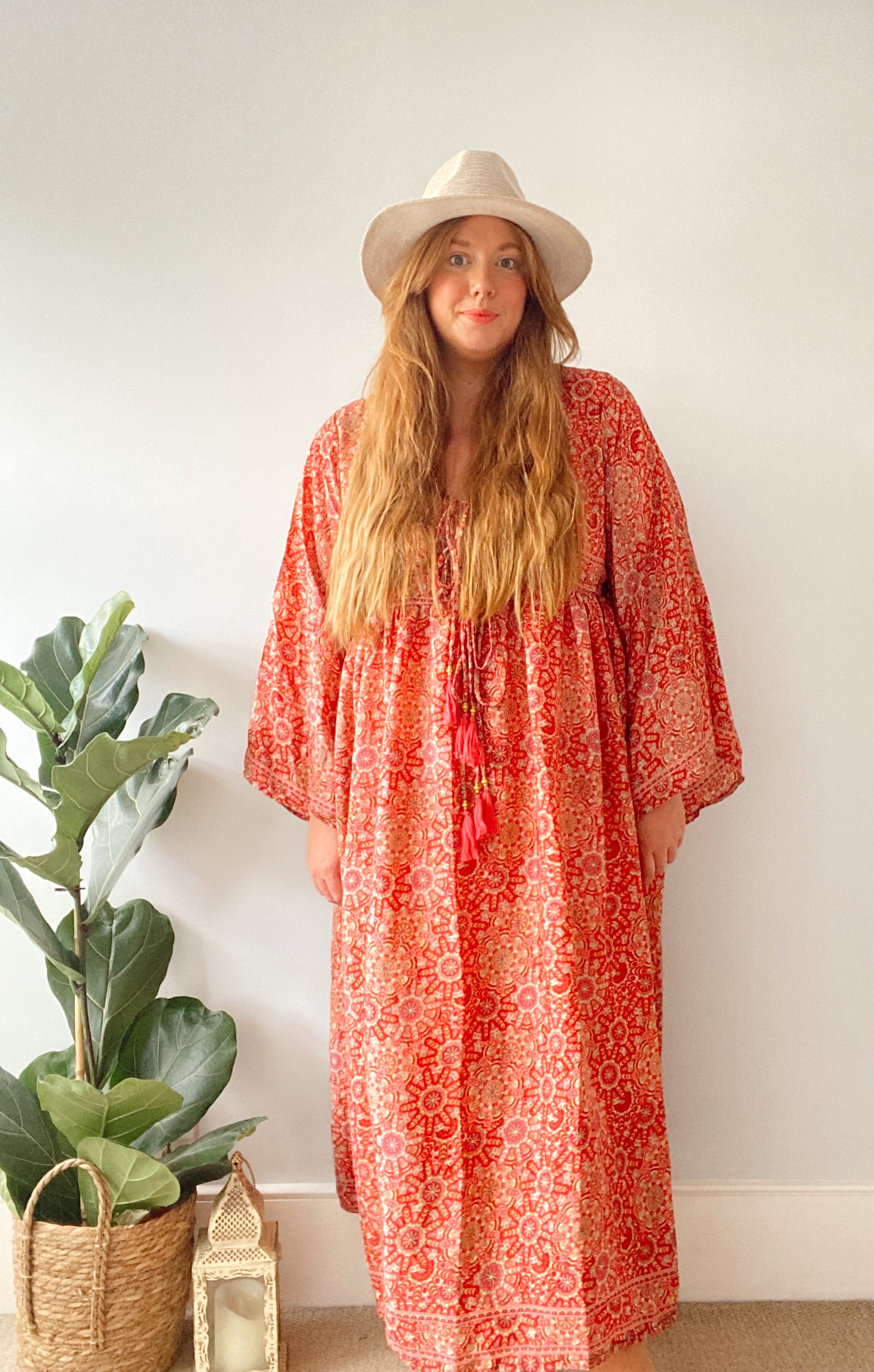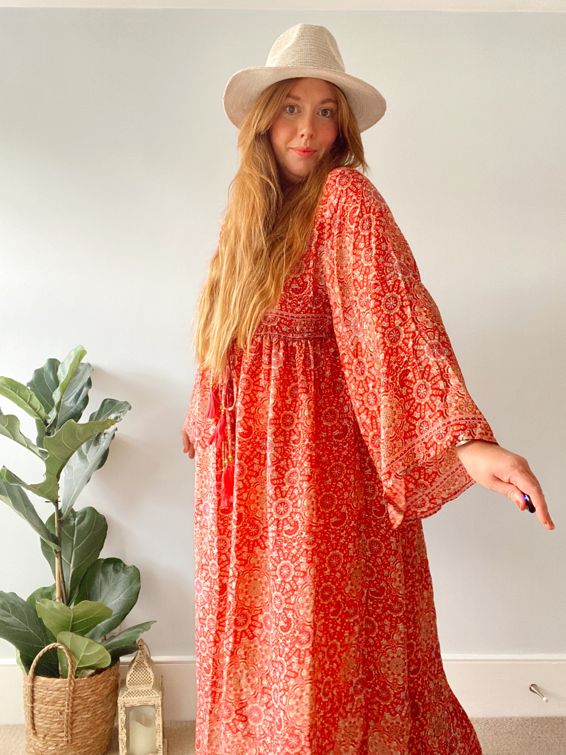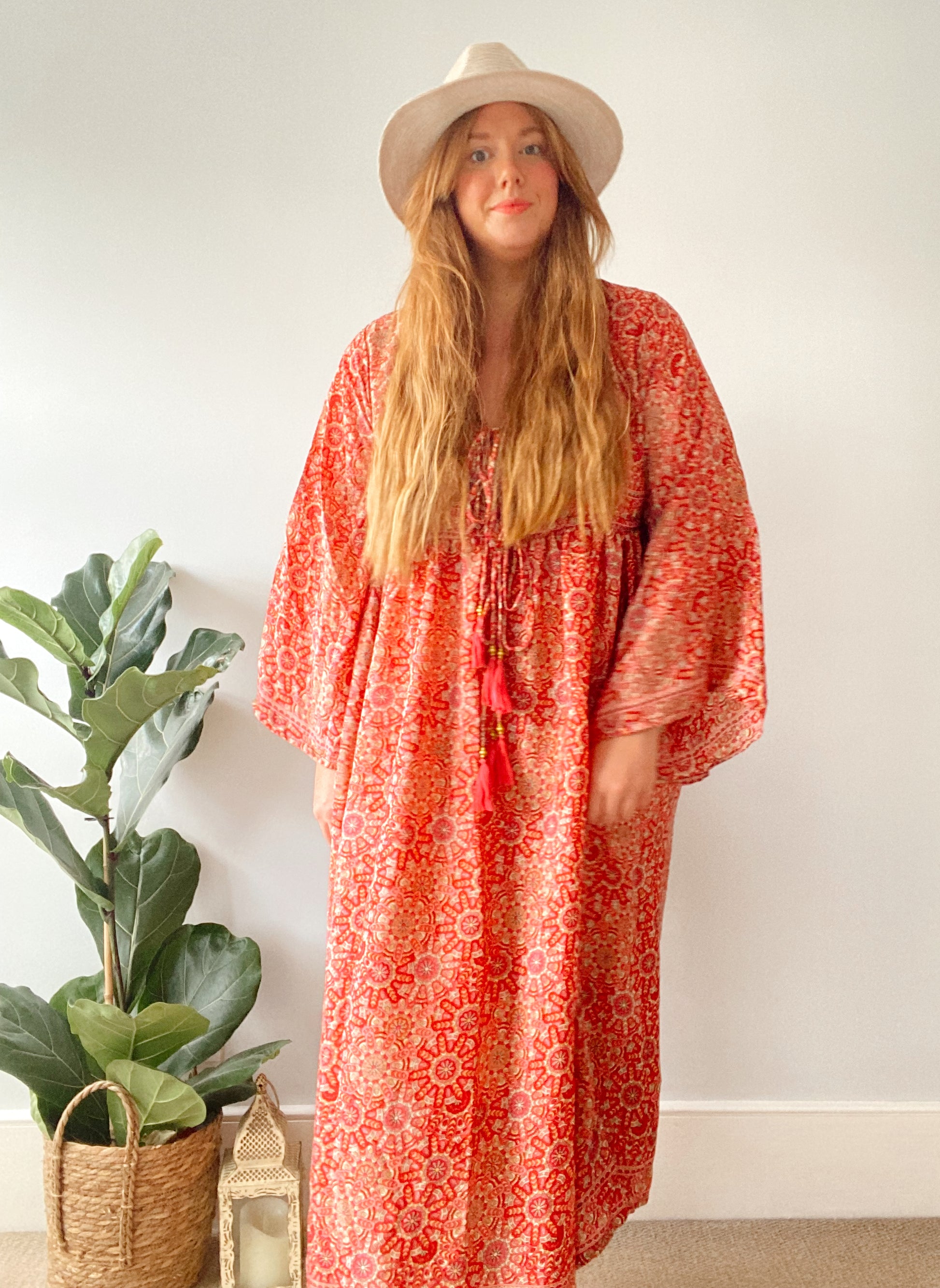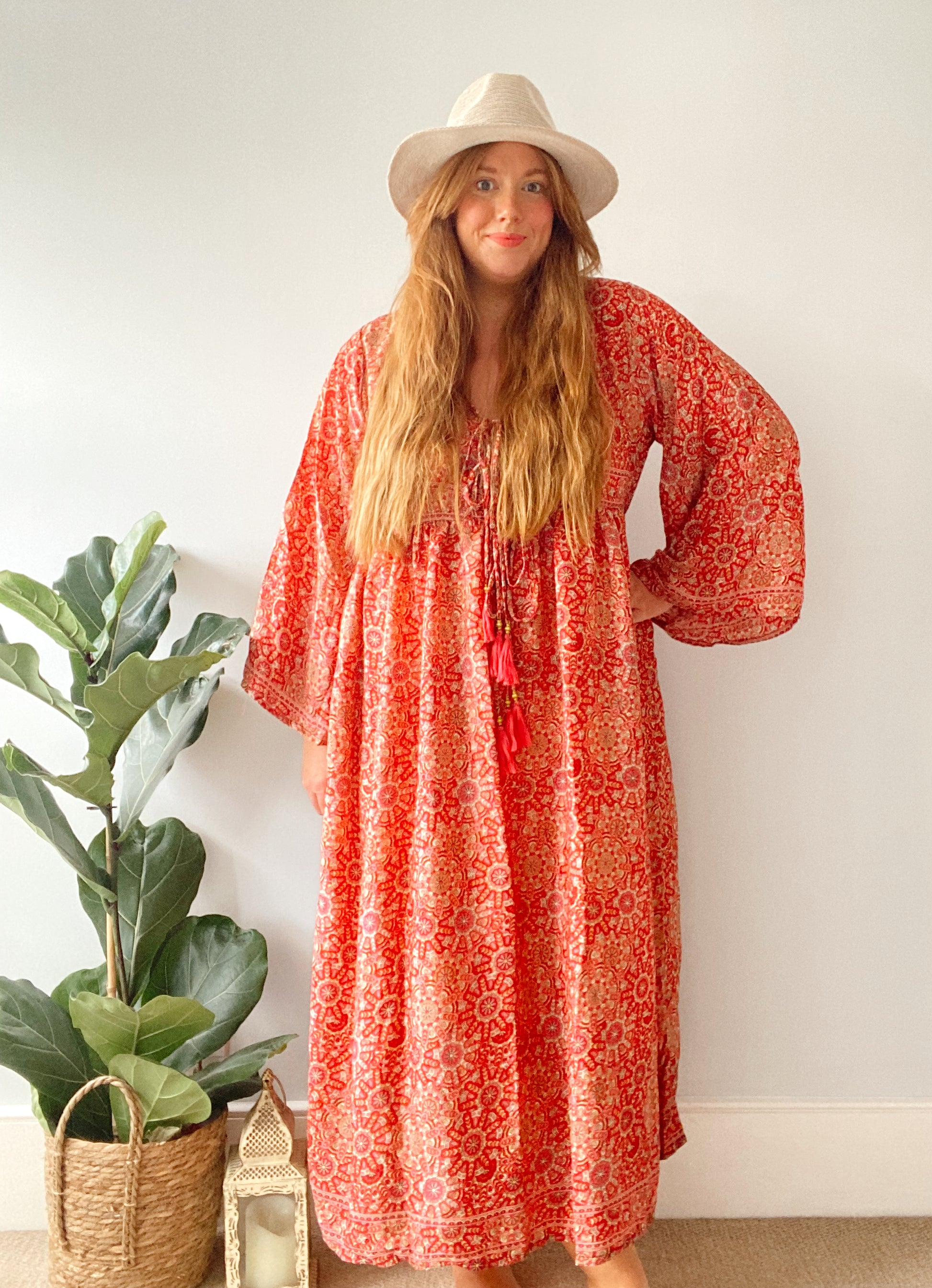 This beautiful Nova dress is made from silk and is a free-size design that can be tied at the waist and bust to suit your figure. It has long flute sleeves and falls into a floaty dress. It features a stunning bohemian vintage-inspired print and is a piece you'll wear through all seasons.