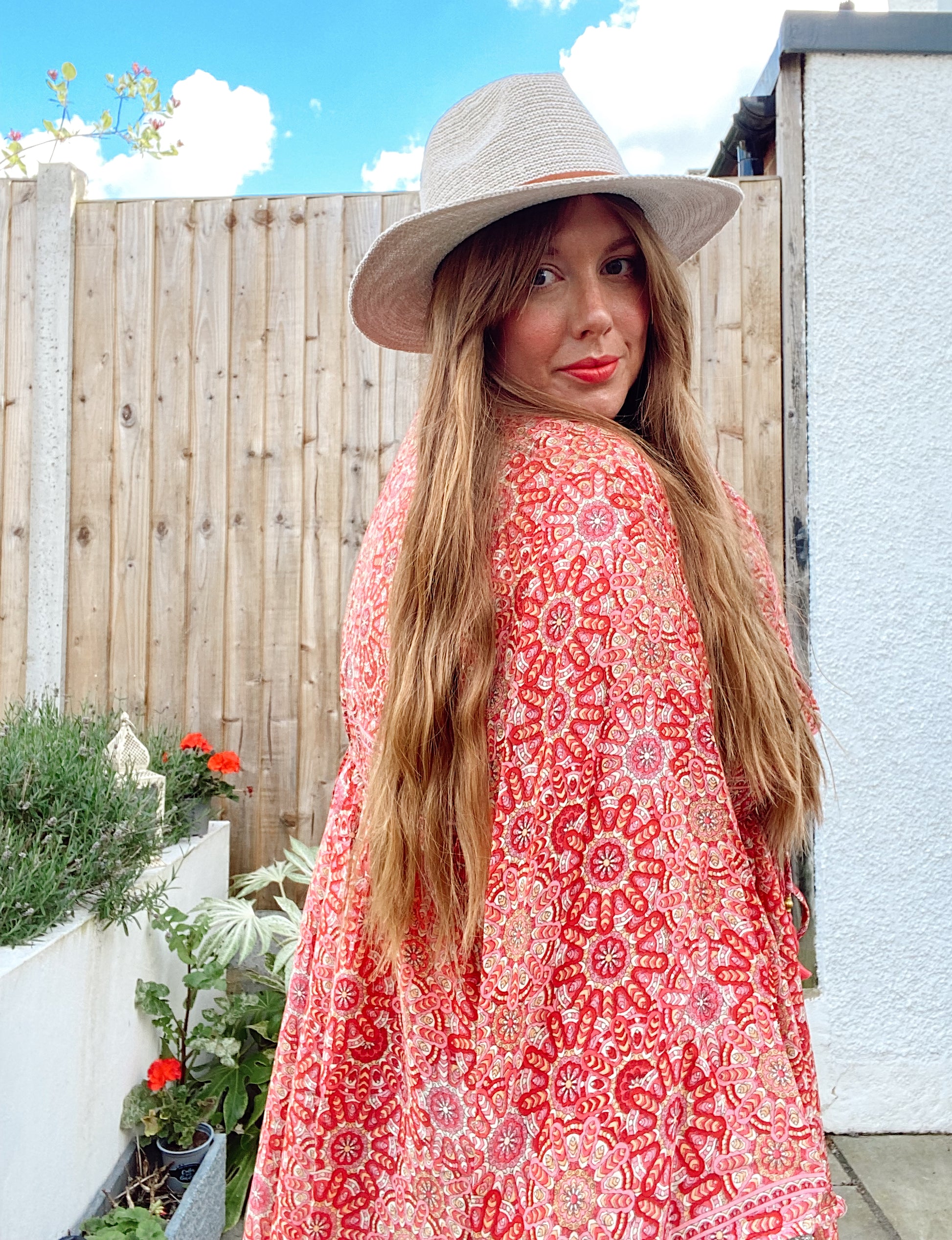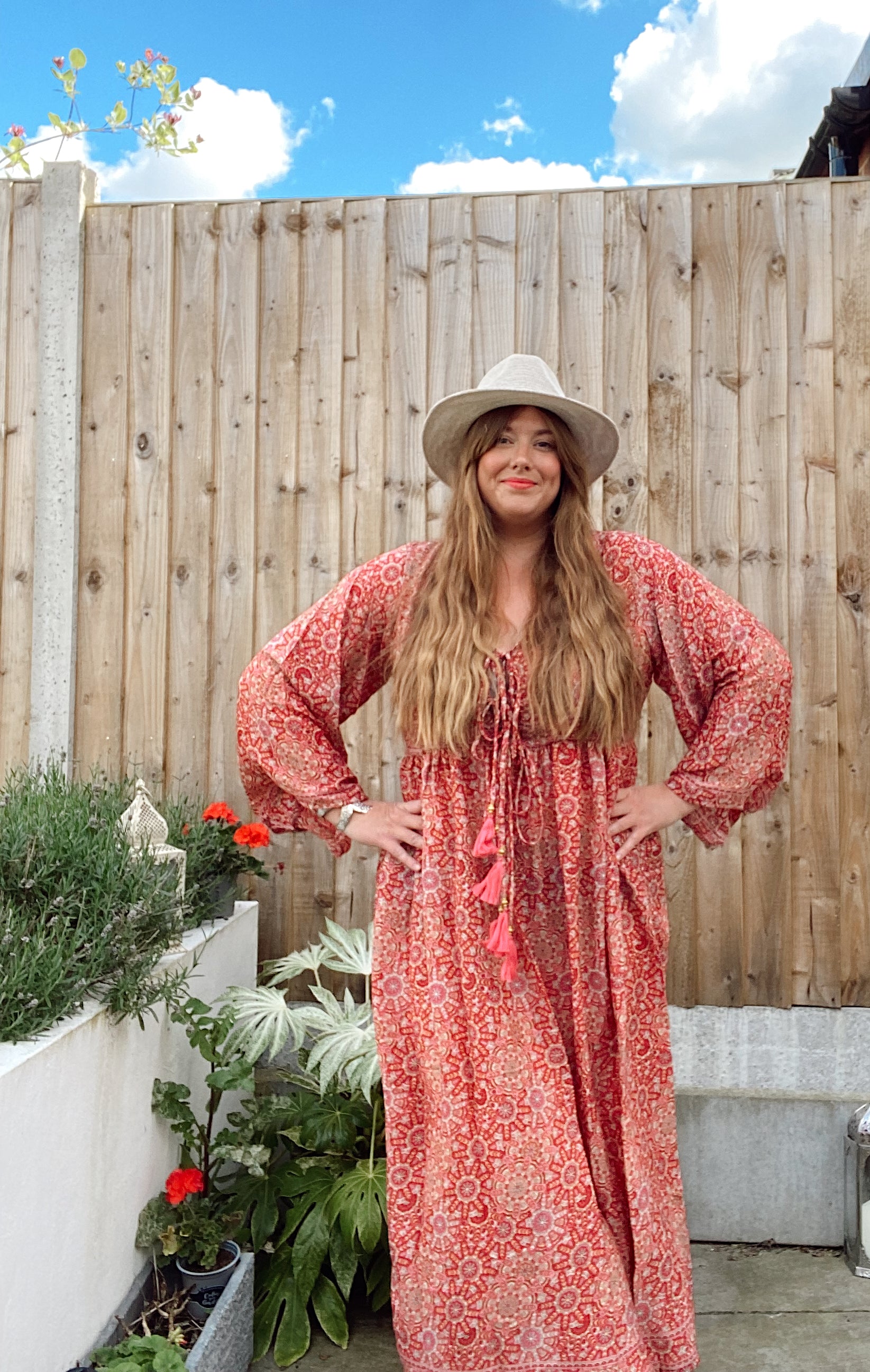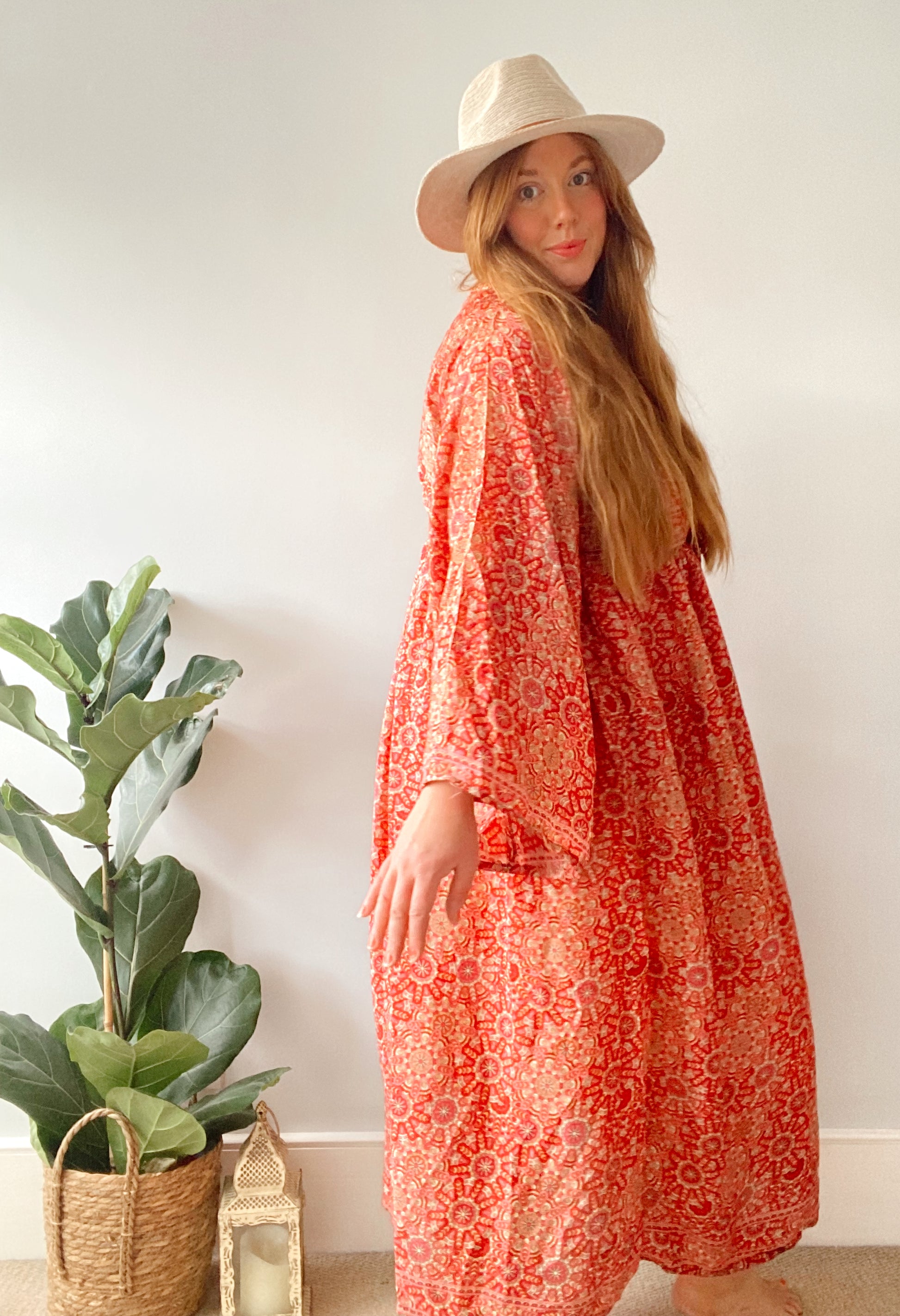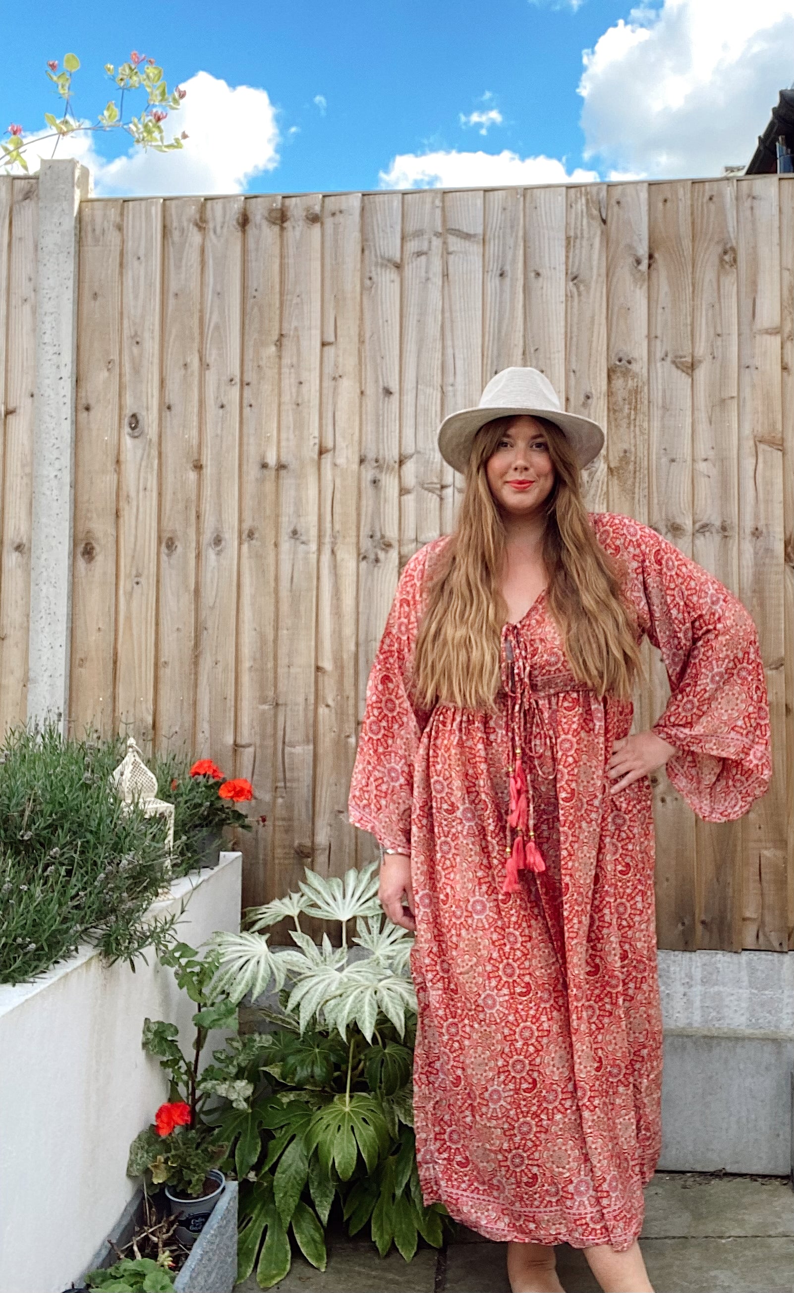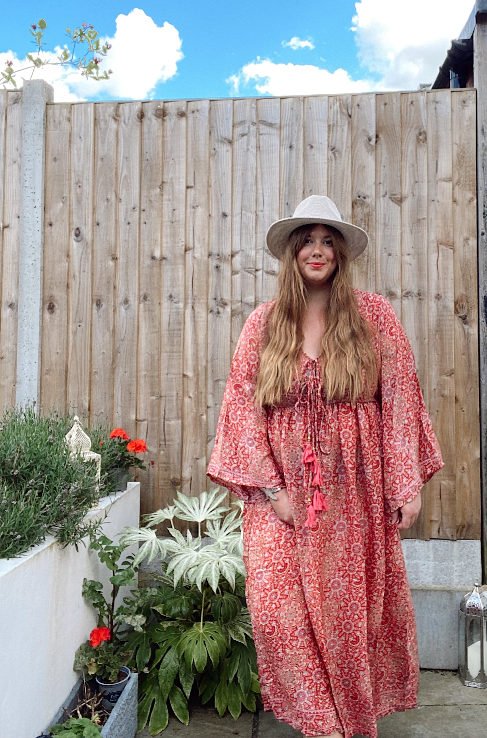 This beautiful Nova dress is made from silk and is a free-size design that can be tied at the waist and bust to suit your figure. It has long flute sleeves and falls into a floaty dress. It features a stunning bohemian vintage-inspired print and is a piece you'll wear through all seasons.