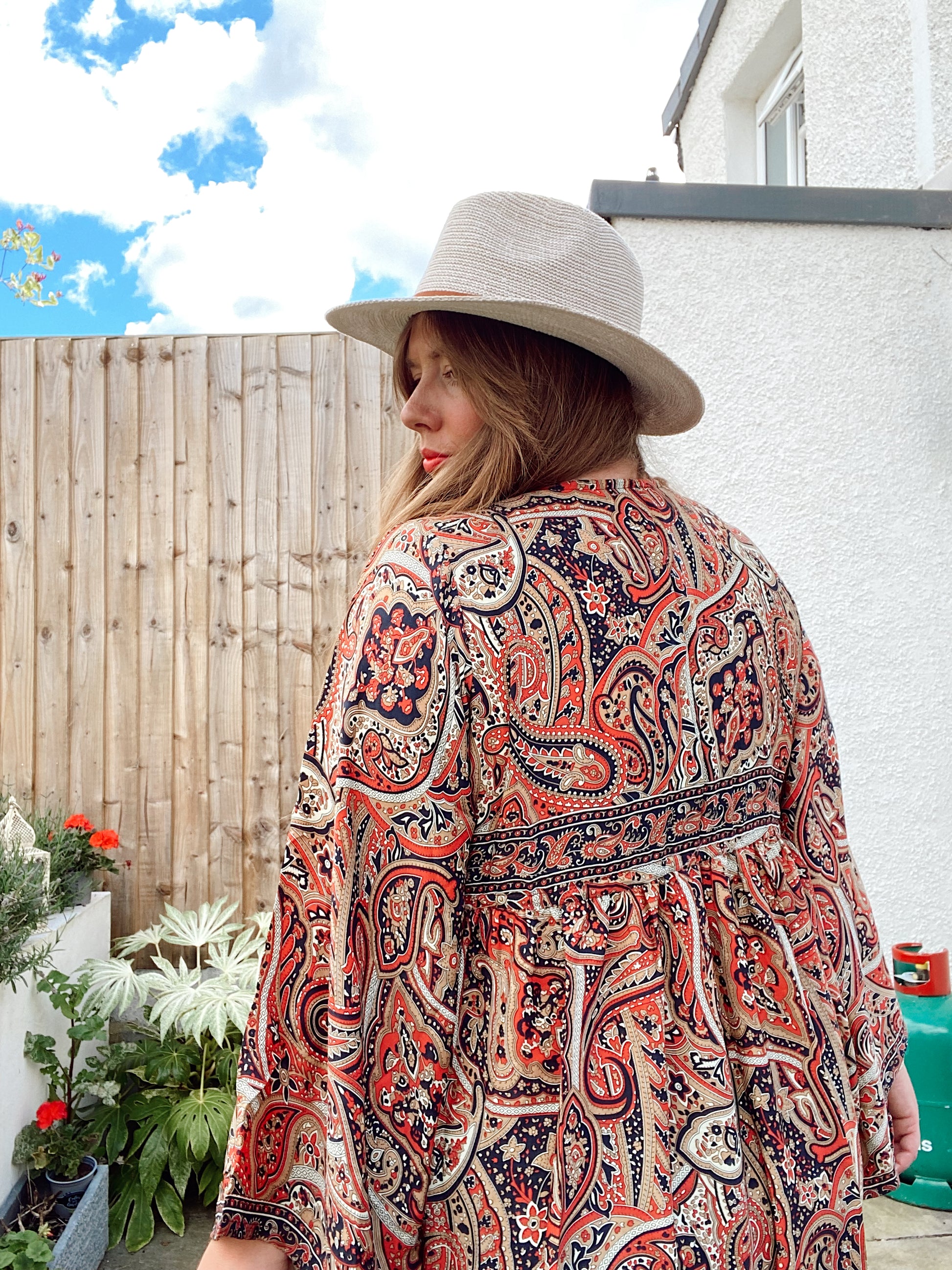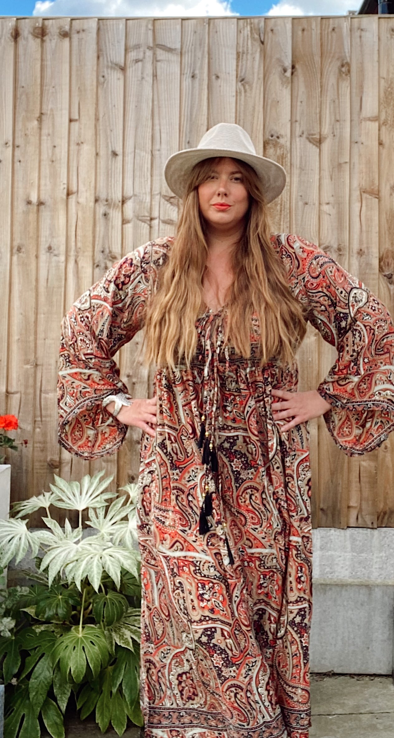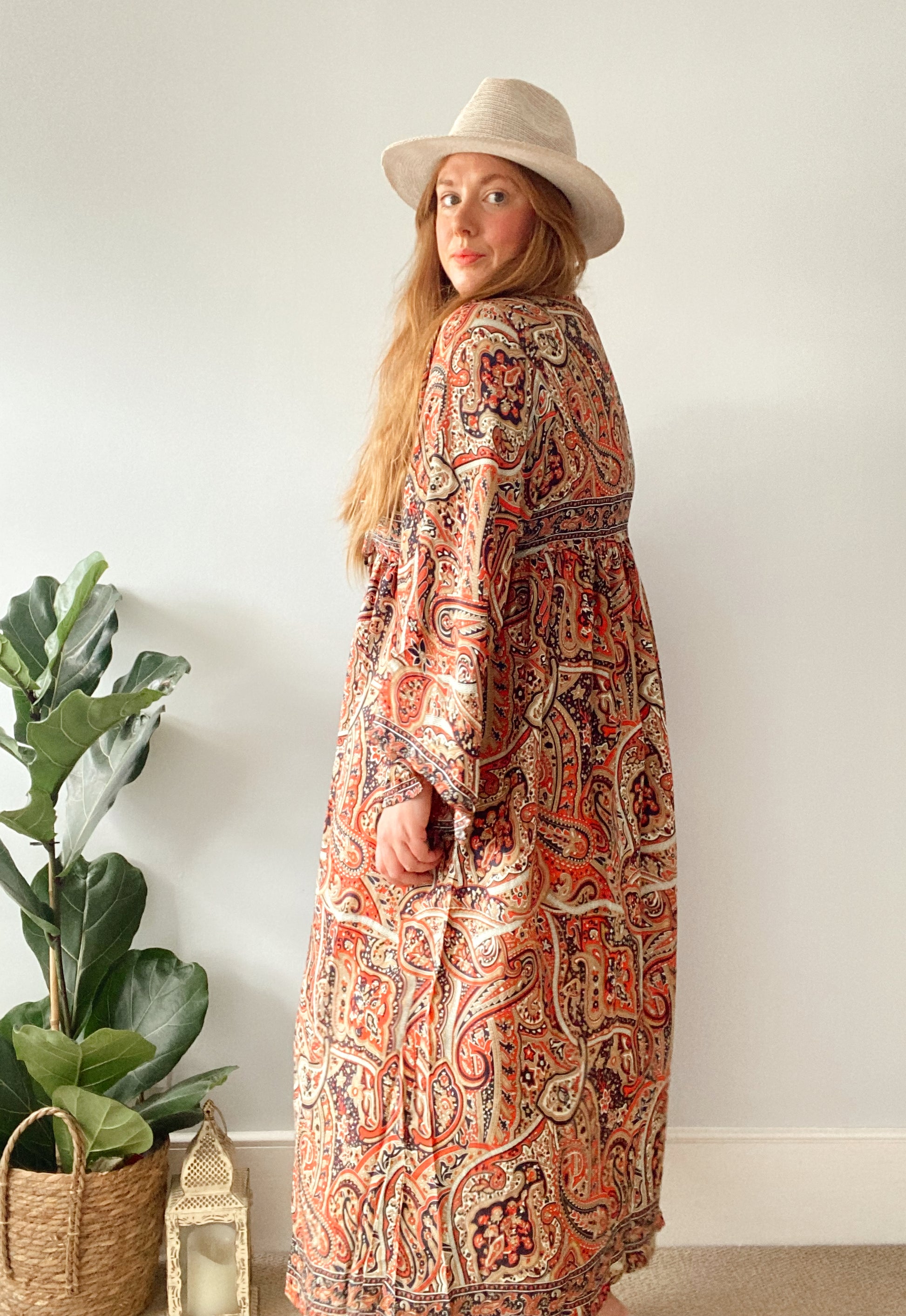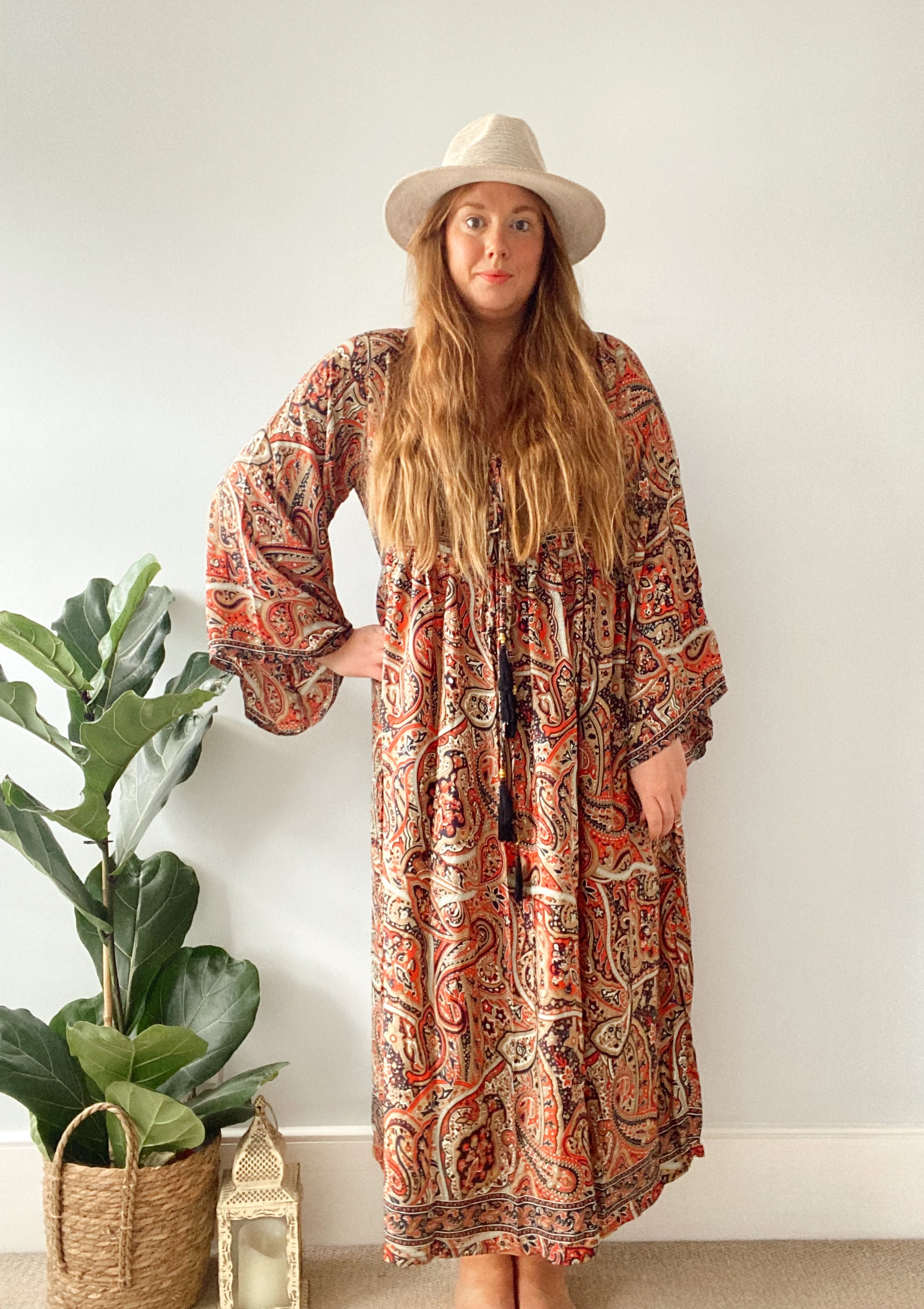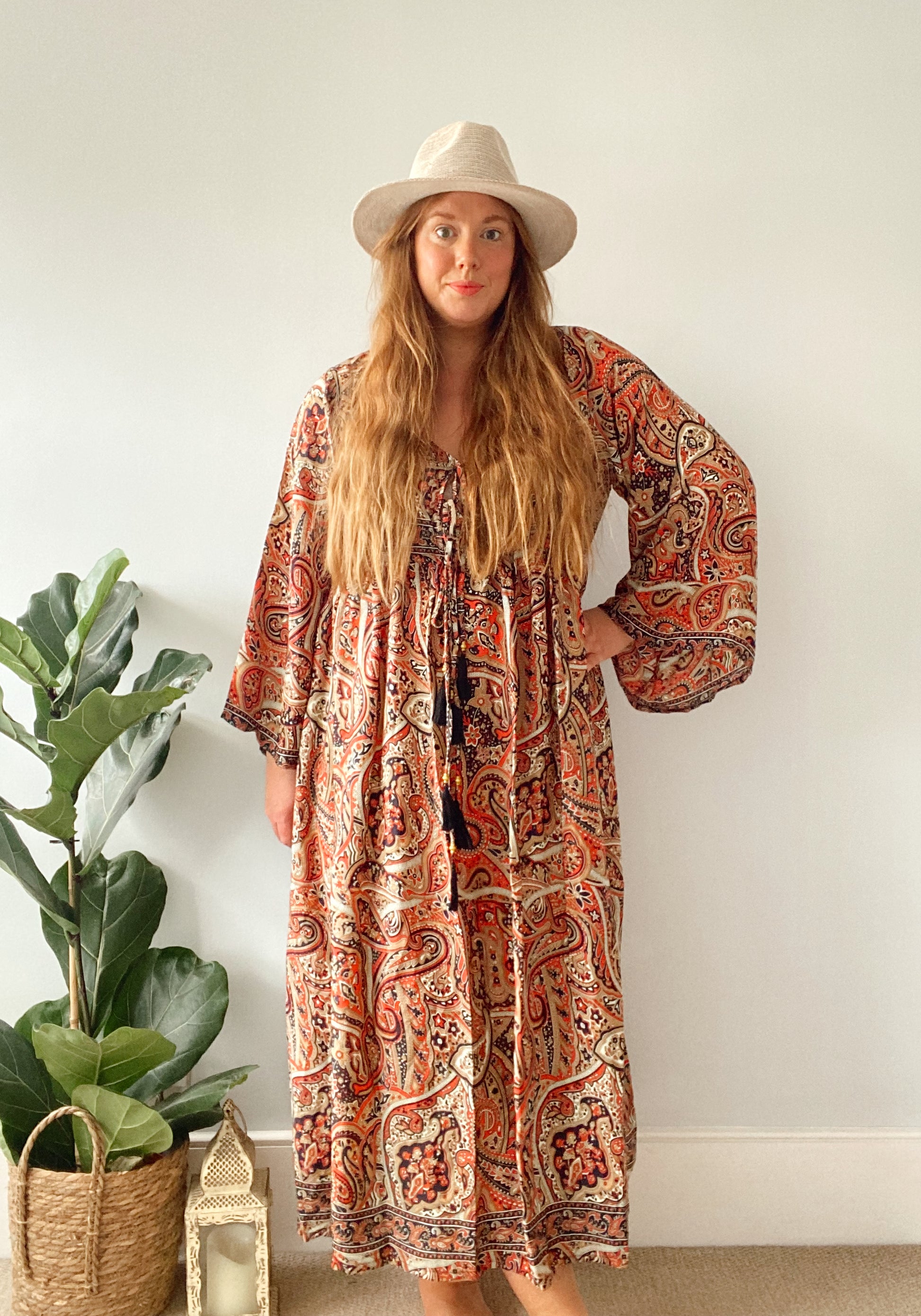 This beautiful Nova dress is made from silk and is a free-size design that can be tied at the waist and bust to suit your figure. It has long flute sleeves and falls into a floaty dress. It features a stunning bohemian vintage-inspired print and is a piece you'll wear through all seasons.