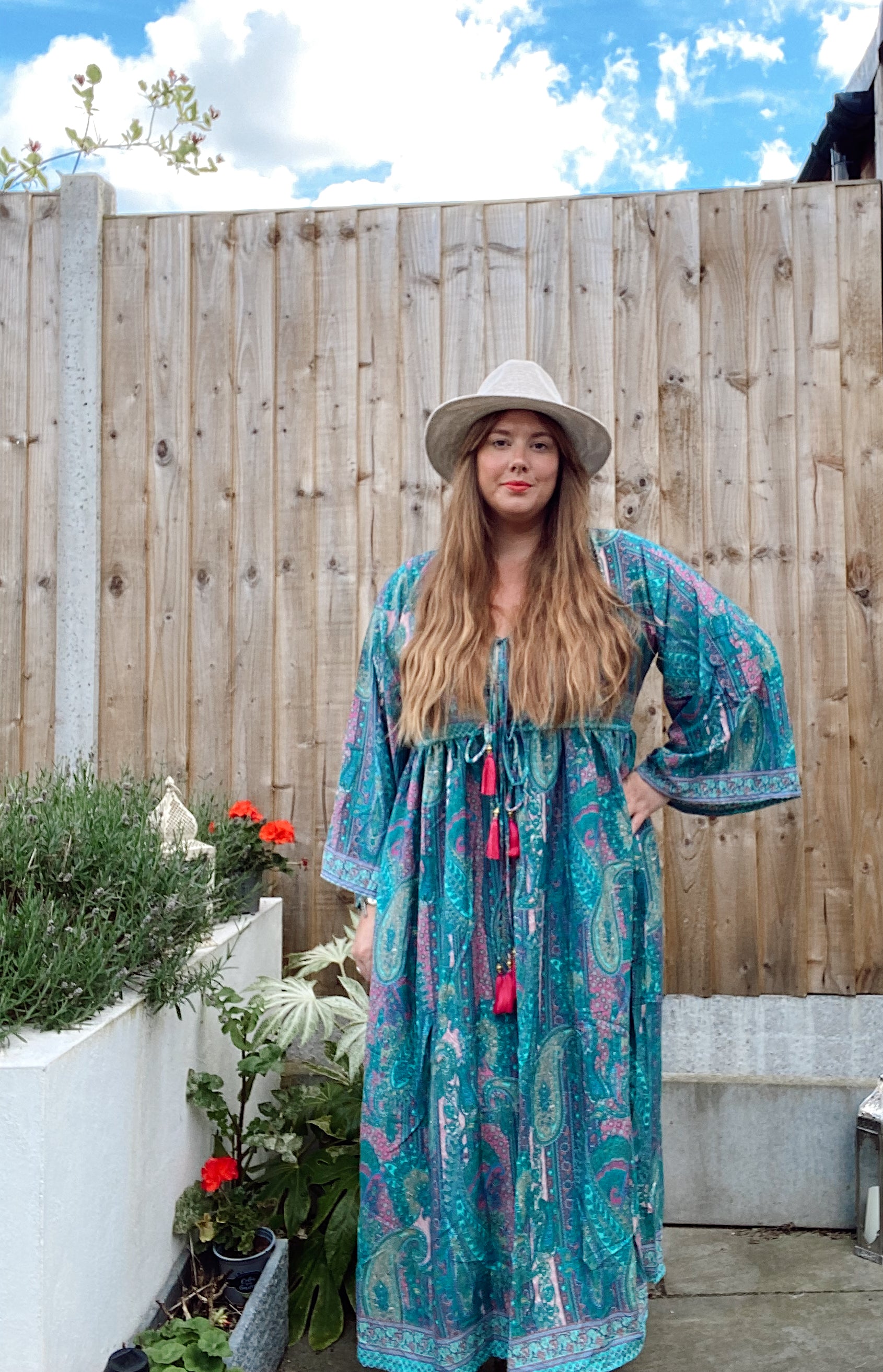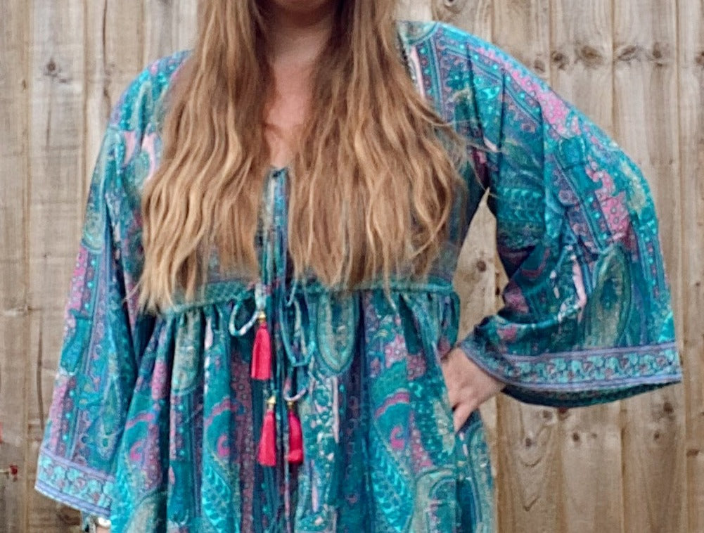 This beautiful Nova dress is made from silk and is a free-size design that can be tied at the waist and bust to suit your figure. It has long flute sleeves and falls into a floaty dress. It features a stunning bohemian vintage-inspired print and is a piece you'll wear through all seasons.