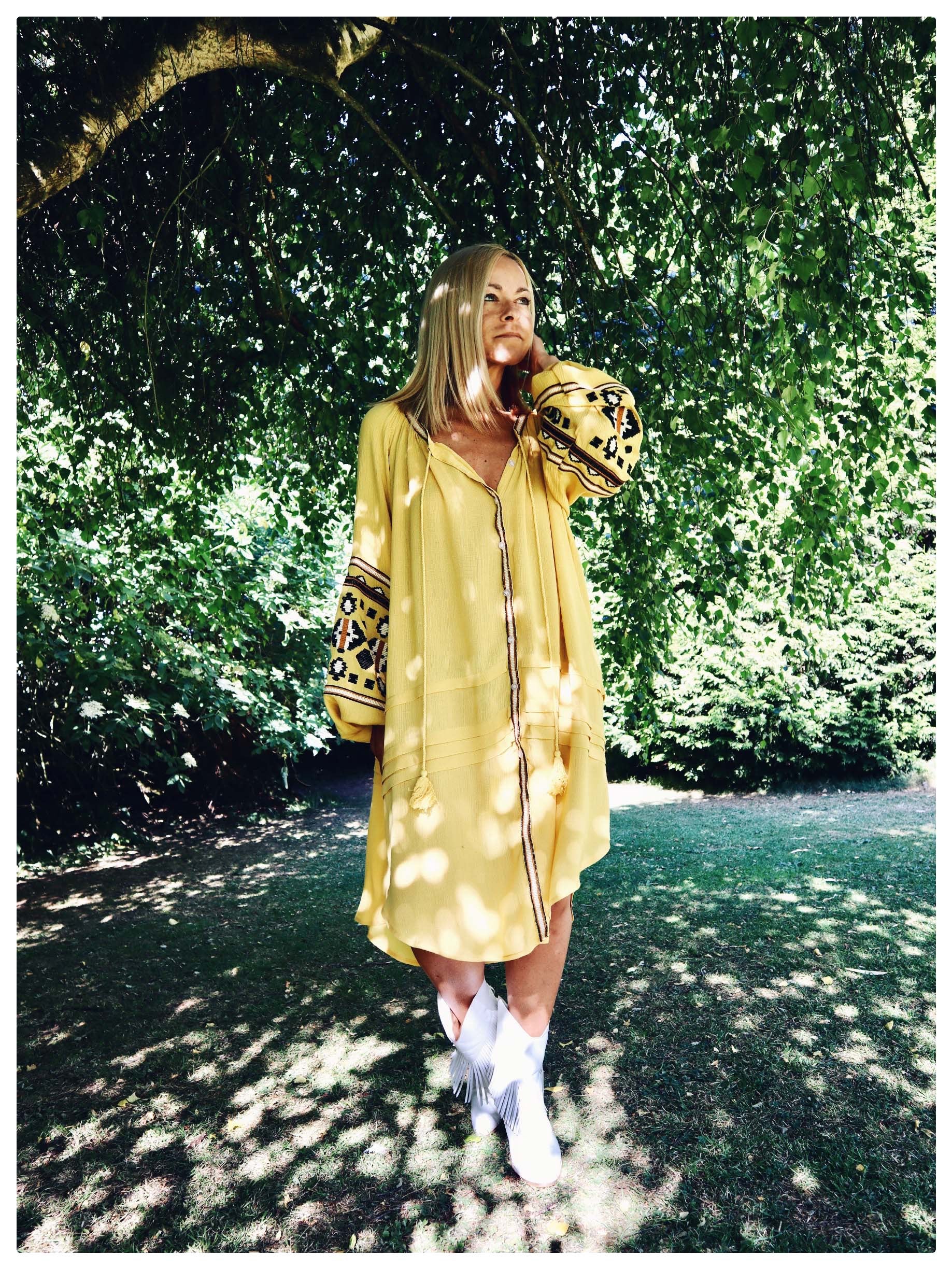 This beautiful bohemian vyshyvanka-style dress is crafted from a blend of cotton and rayon, and is ideal for all seasons. It's a loose fit with lantern sleeves and it falls just at the thigh. It's complete with intricate embroidery and tassels giving this piece a vintage finish.